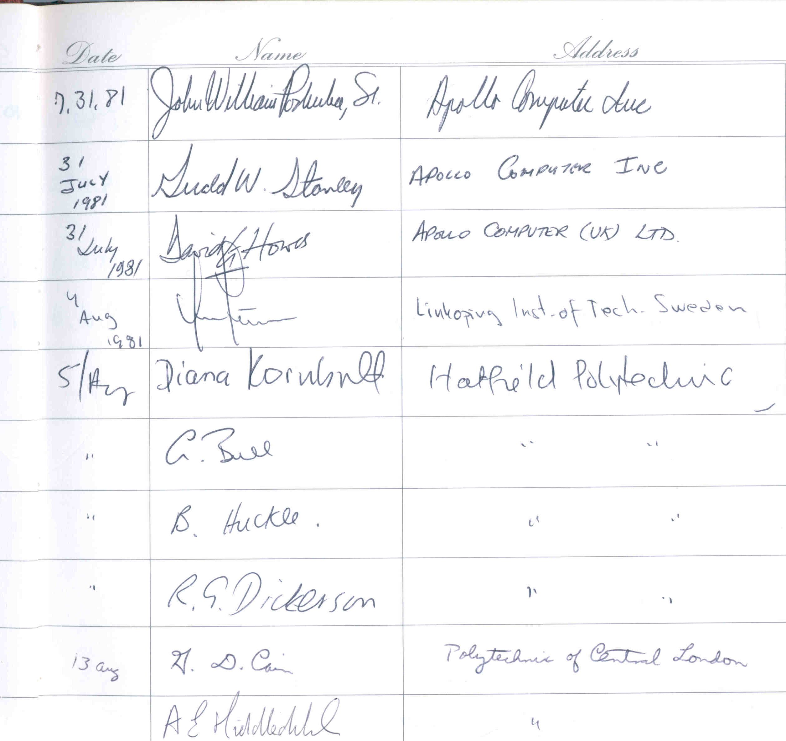 A Visitors Book was placed in the PERQ Demonstration Room. Not everybody signed it but it did give some indication of the people who came to see the early PERQ early on.