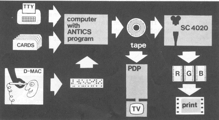 The computing side of the Antics system is quite straightforward; the crucial part of the process is the hardware problem of transferring the results to film. The simplest answer to this is the one being used most successfully by SynthaVision - the 3D simulation system I mentioned earlier. They use a device made by Information Displays Inc. of New York: it consists simply of a precision black-and-white TV display, a movie camera with colour film, and a rotating red-green-blue filter disc; these are controlled automatically by a mini-computer from information on magnetic tape. The whole unit - tape deck, minicomputer, TV display, colour wheel and camera - costs about £20,000 (cheap by computer standards!) and gives thoroughly excellent results very economically.