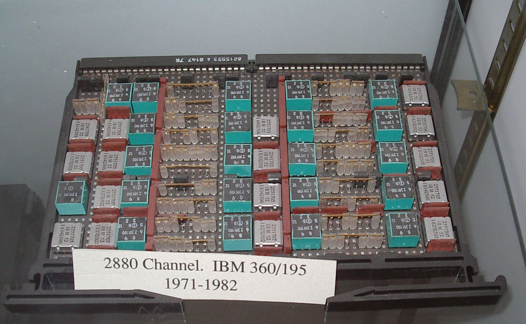 The 360/195 used monolithic integrated ECL circuits for the arithmetic and logic operations in the central processor combined with the 32 Kbyte high speed buffer memory. Each silicon memory chip was about 0.125 inches square and consisted of 664 transistors and diodes etc. Each memory chip contained from two to four circuits, stored 64 bits of data, and were mounted on a 0.5 inch ceramic substrate. The monolithic circuits transmitted signals in 3-5 nanoseconds.