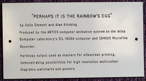 Retained Plastic • 'Perhaps it is the rainbows egg' by Colin Emmett and Alan Kitching / Produced by the ANTICS animation system on the Atlas Computer Laboratory's ICL 1906A computer and DS4020 Microfilm Recorder. / Hardcopy output used as masters for silkscreen printing, demonstrating possibilities for high resolution multi-colour diagrams, wallcharts and posters. |