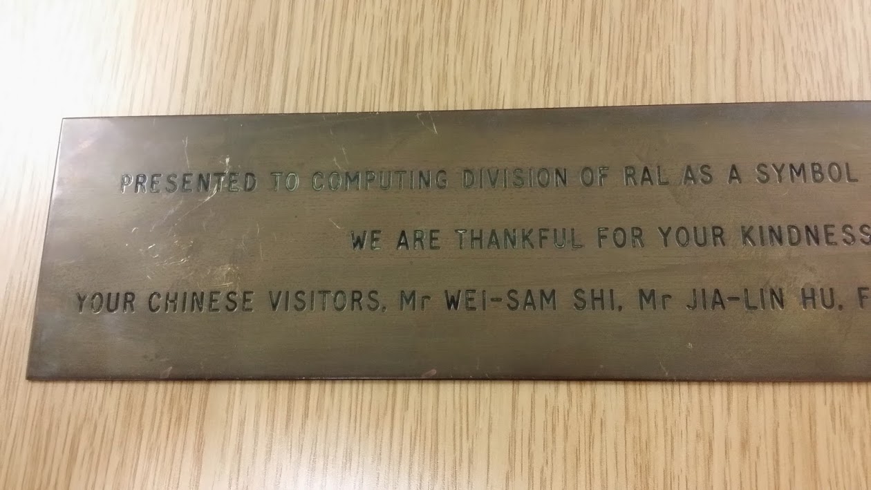 Retained Brass • Presented to Computing Division of RAL as a symbol of friendship between two computing divisions / We are thankful for your kindness to us during our stay at RAL / Your Chinese visitors, Mr Wei-Sam Shi, Mr Jia-Lin Hu, from Computing Division of IHEP Beijing. May 1983. |