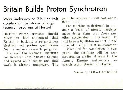 British Prime Minister Harold Macmillan has announced that Britain is building a seven-billion electron volt proton synchrotron for its nuclear research program.