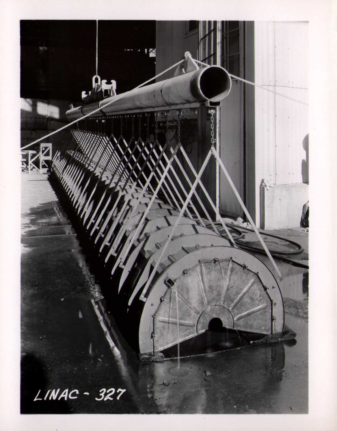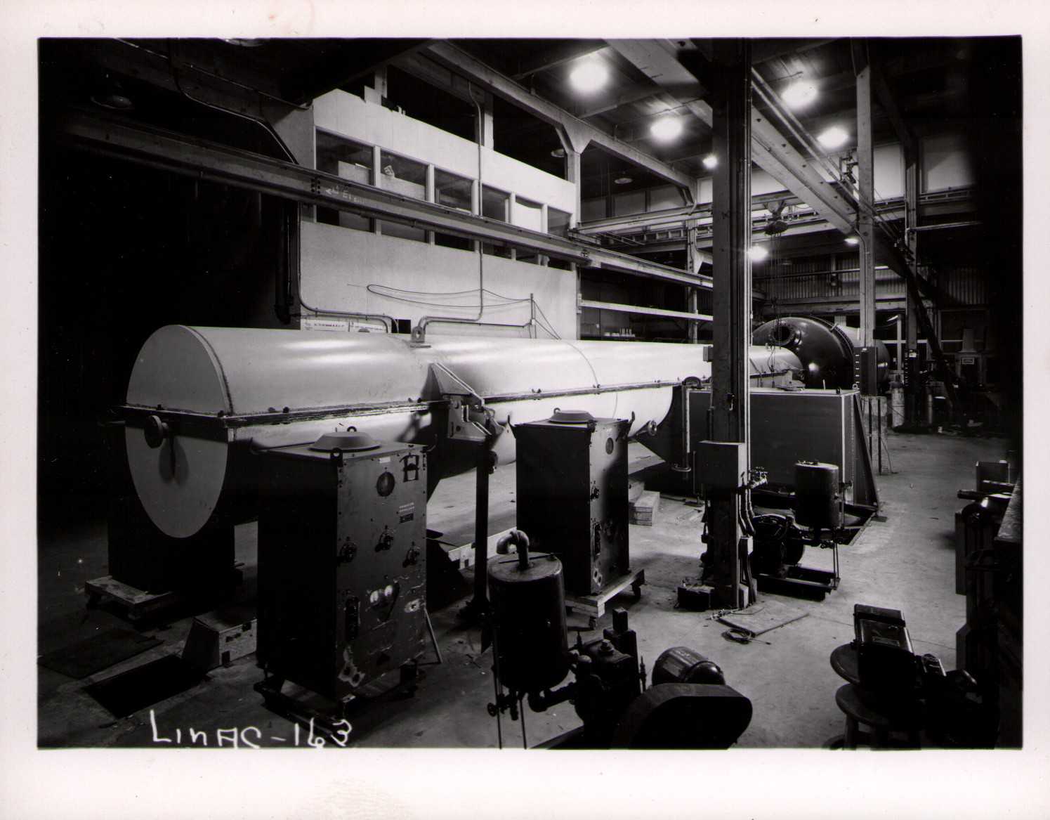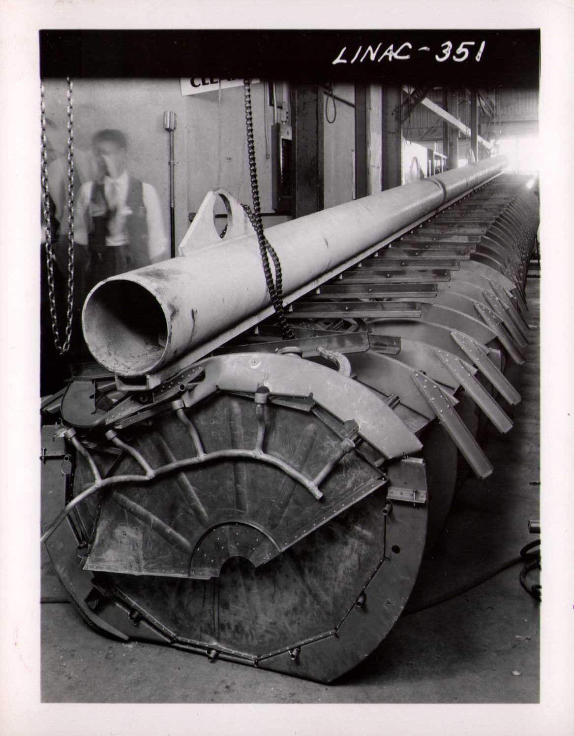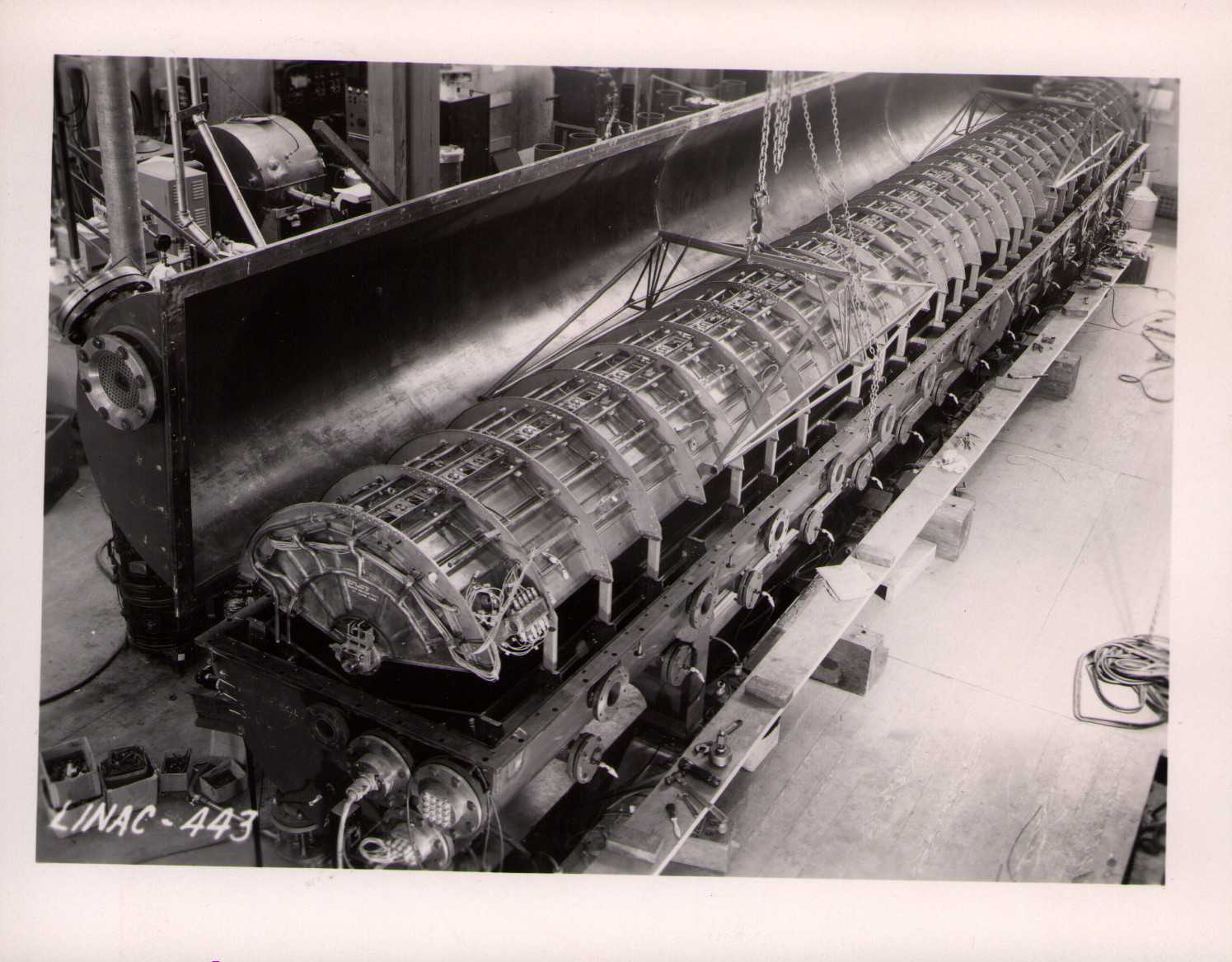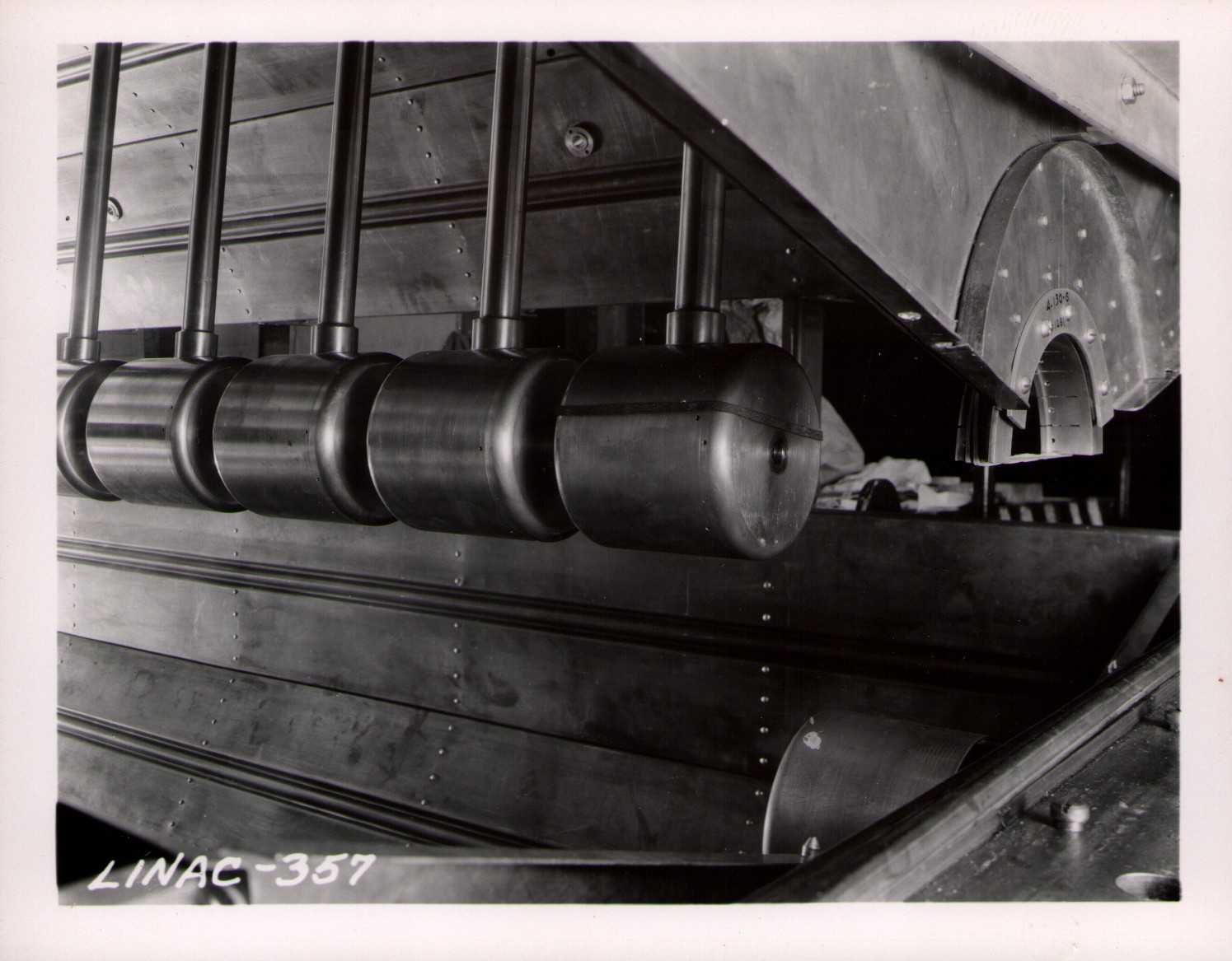 Luis Alvarez's linac, operational in 1947-48. This was the first proton linear accelerator and used drift tubes within a resonant cavity to accelerate protons to 32 MeV. On the back of each photo is stamped "Information Division, Radiation Laboratory / University of California, Berkeley, California." This set of photos was collected by Bernard Loach.