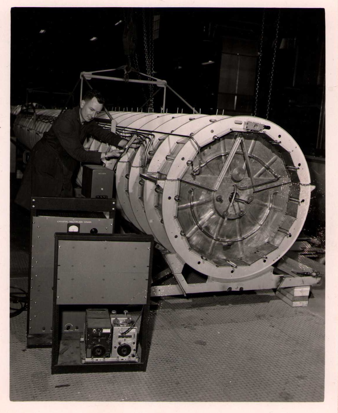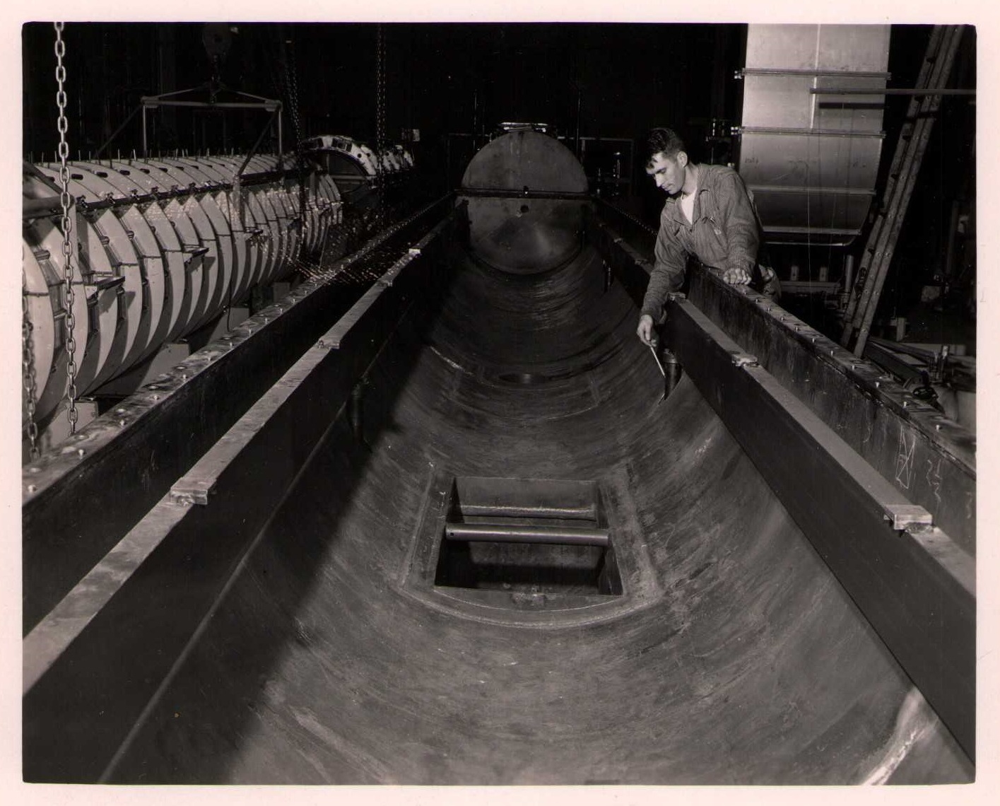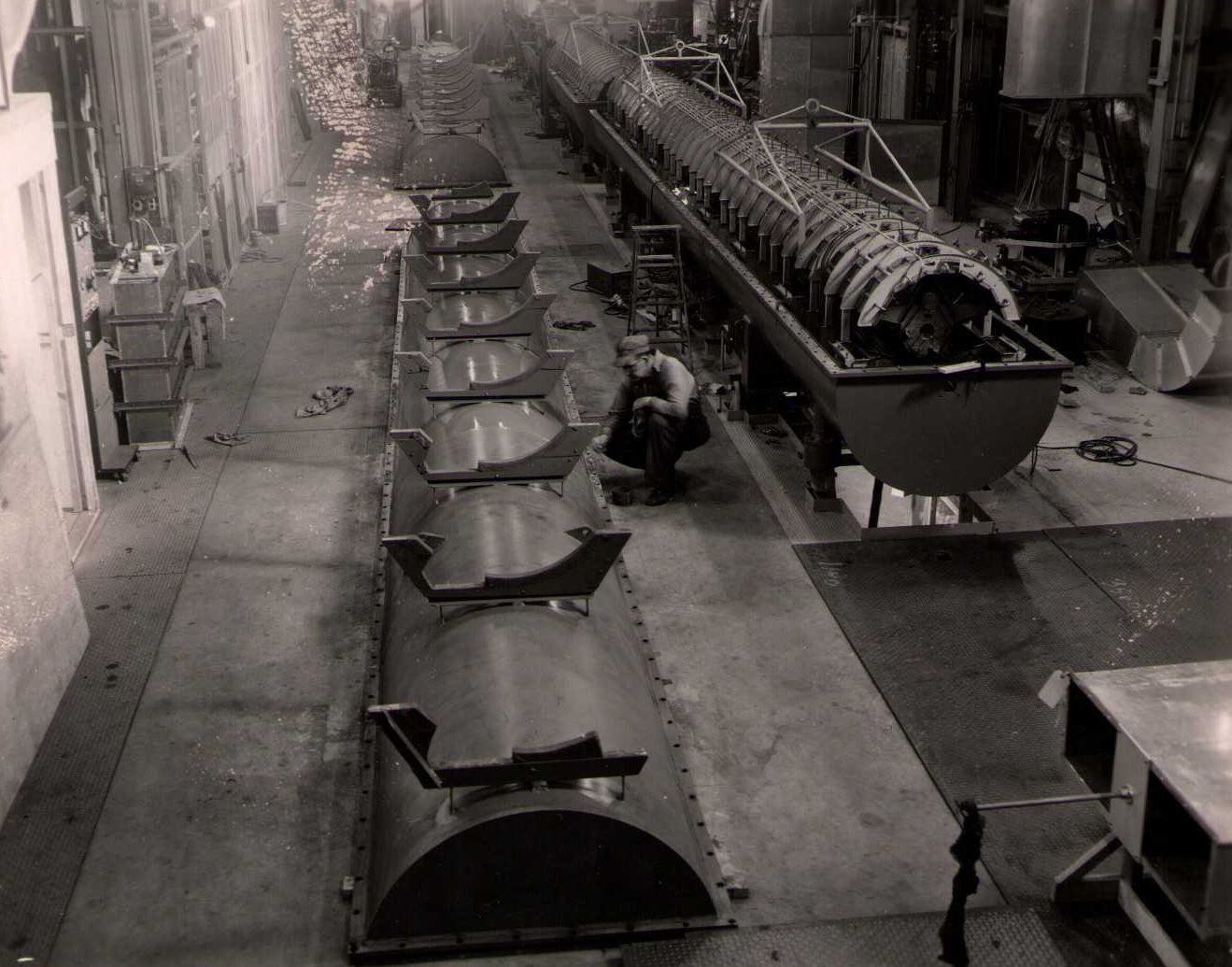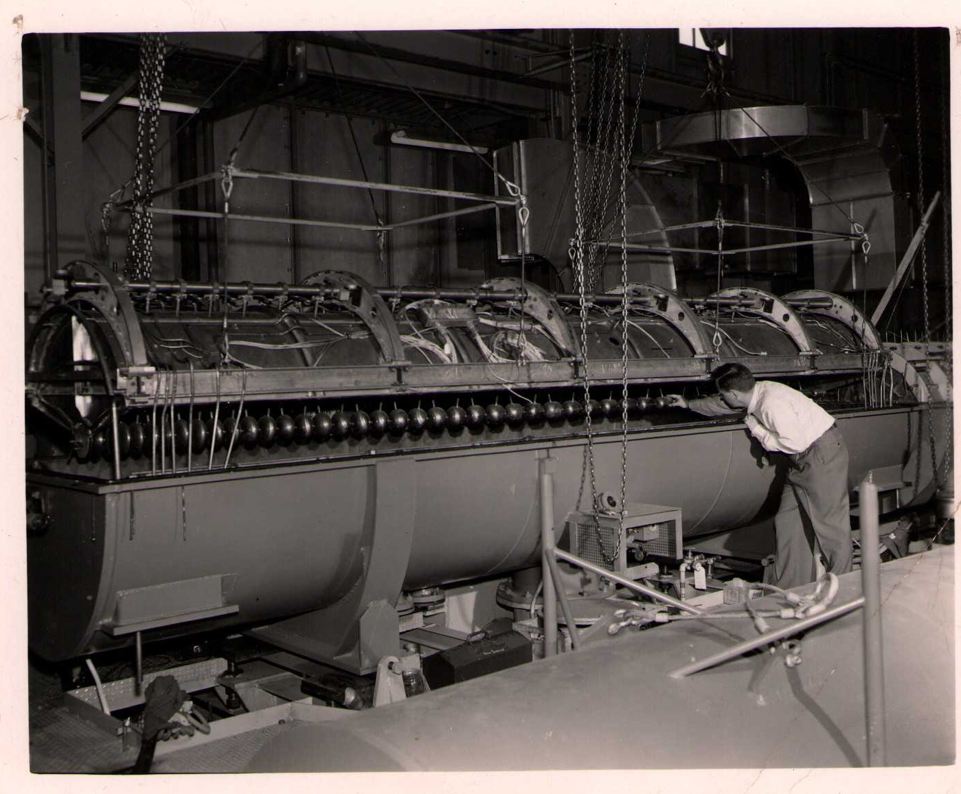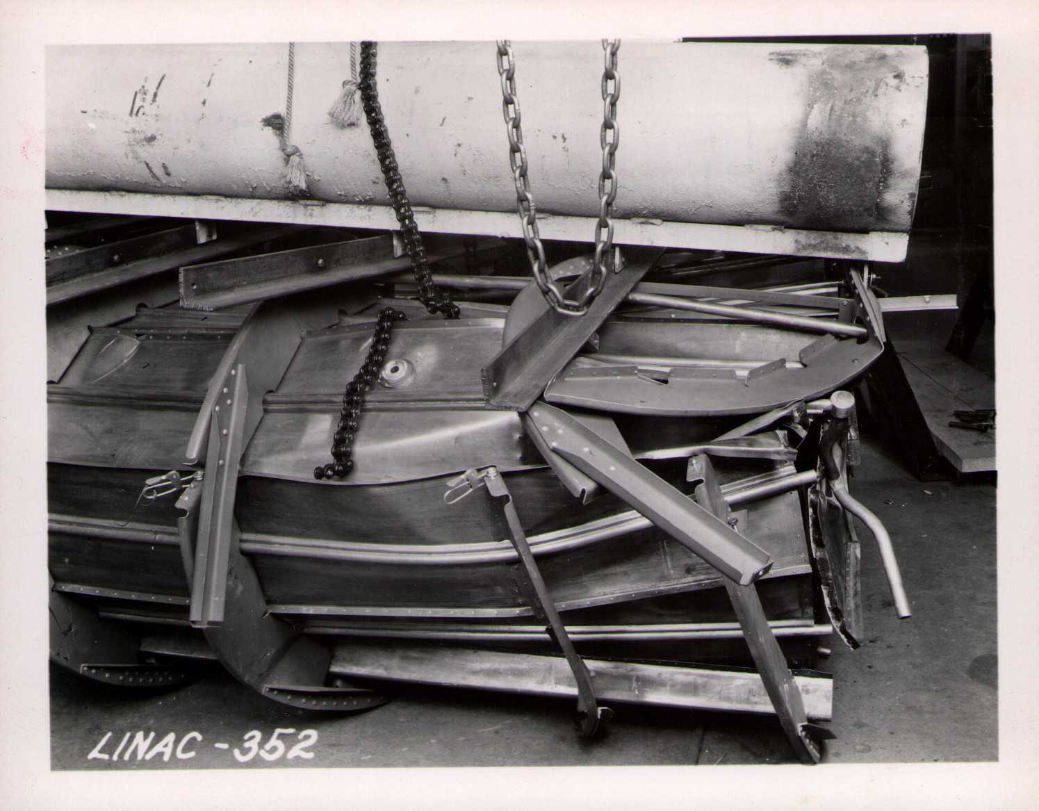 Luis Alvarez's linac, operational in 1947-48. This was the first proton linear accelerator and used drift tubes within a resonant cavity to accelerate protons to 32 MeV. On the back of each photo is stamped "Information Division, Radiation Laboratory / University of California, Berkeley, California." This set of photos was collected by Bernard Loach.