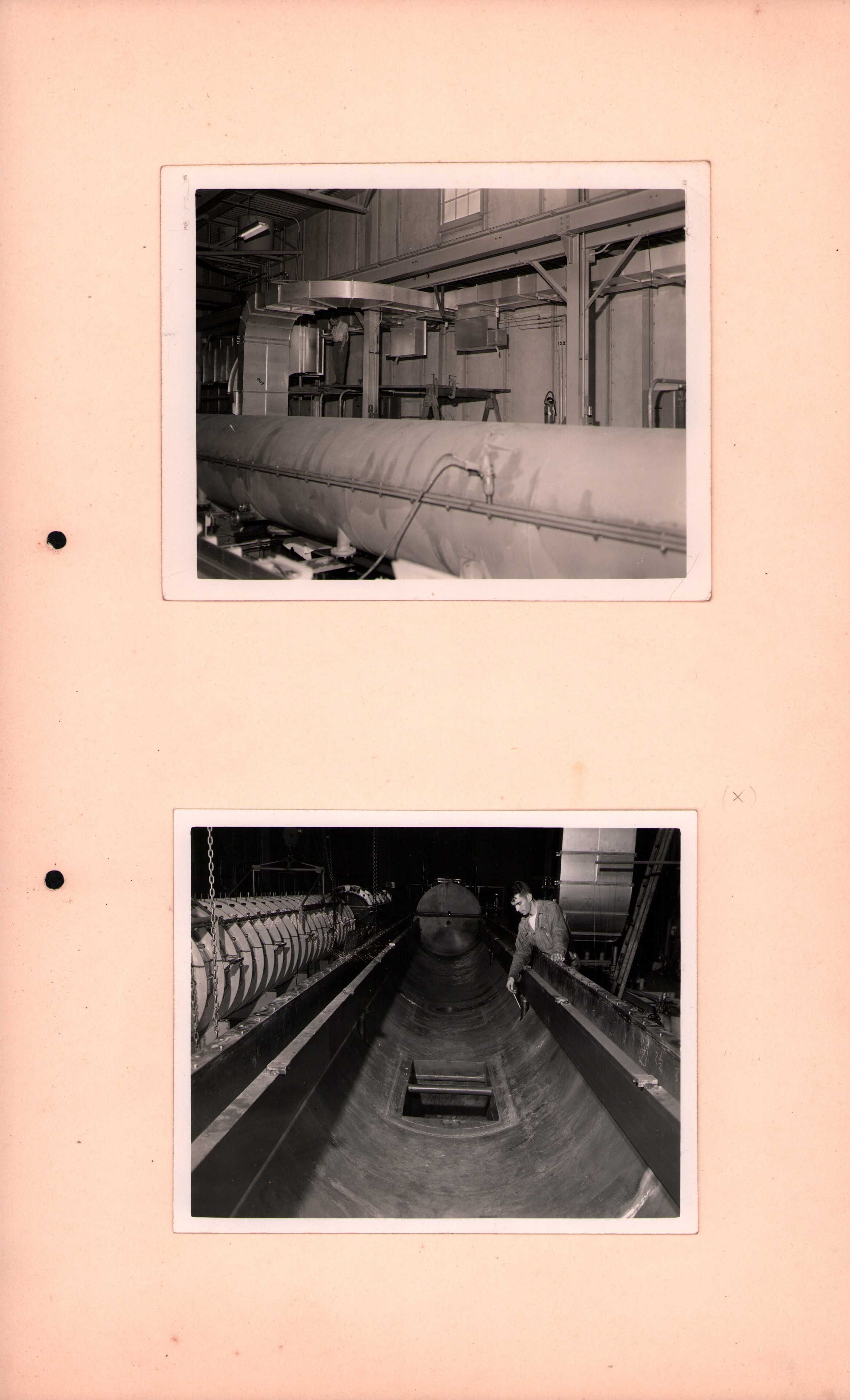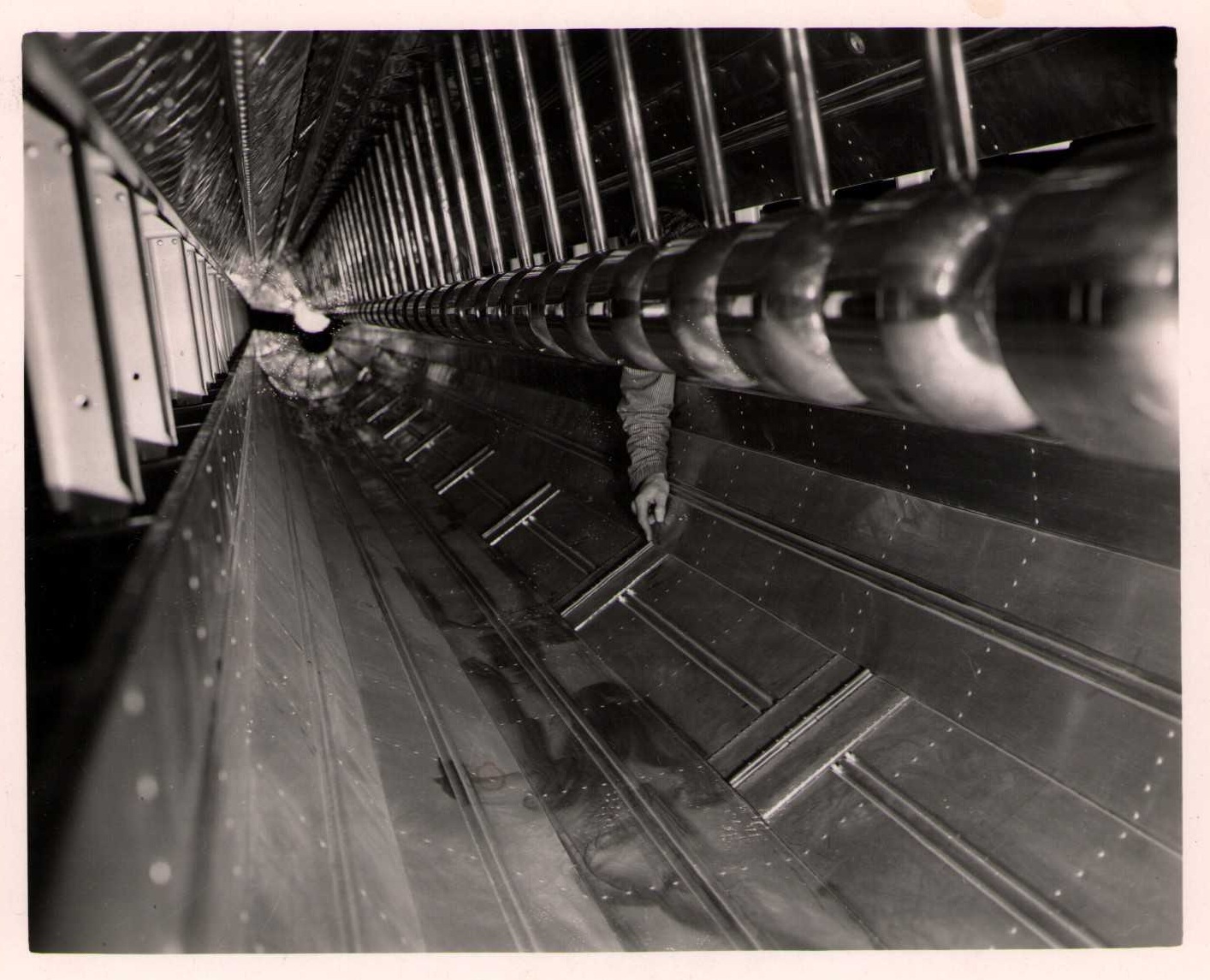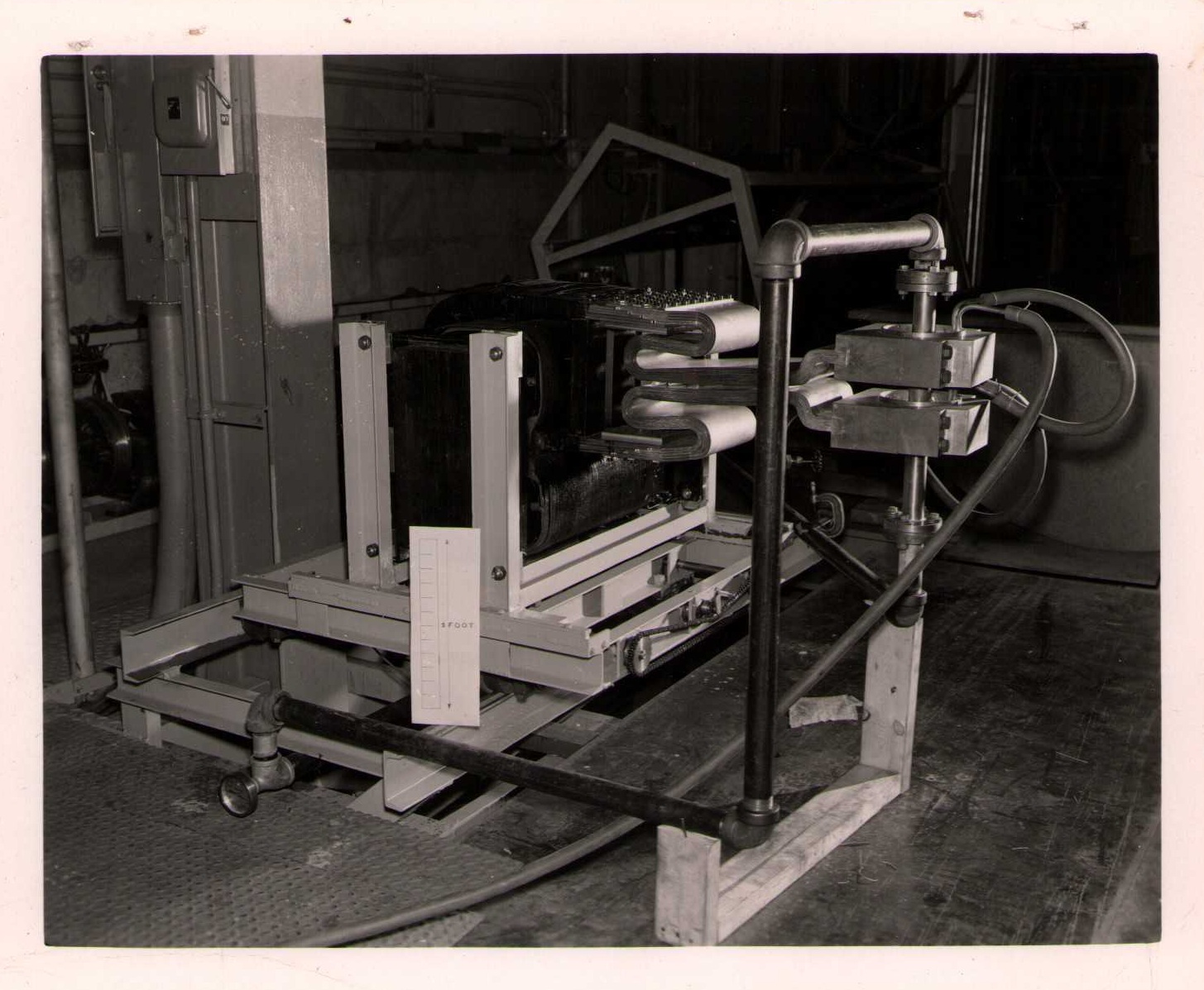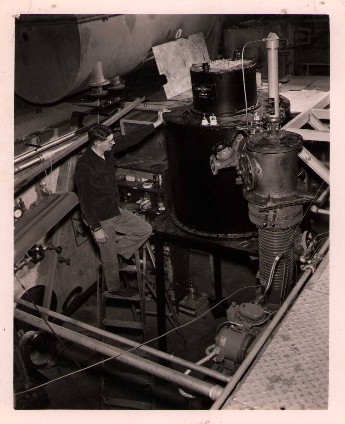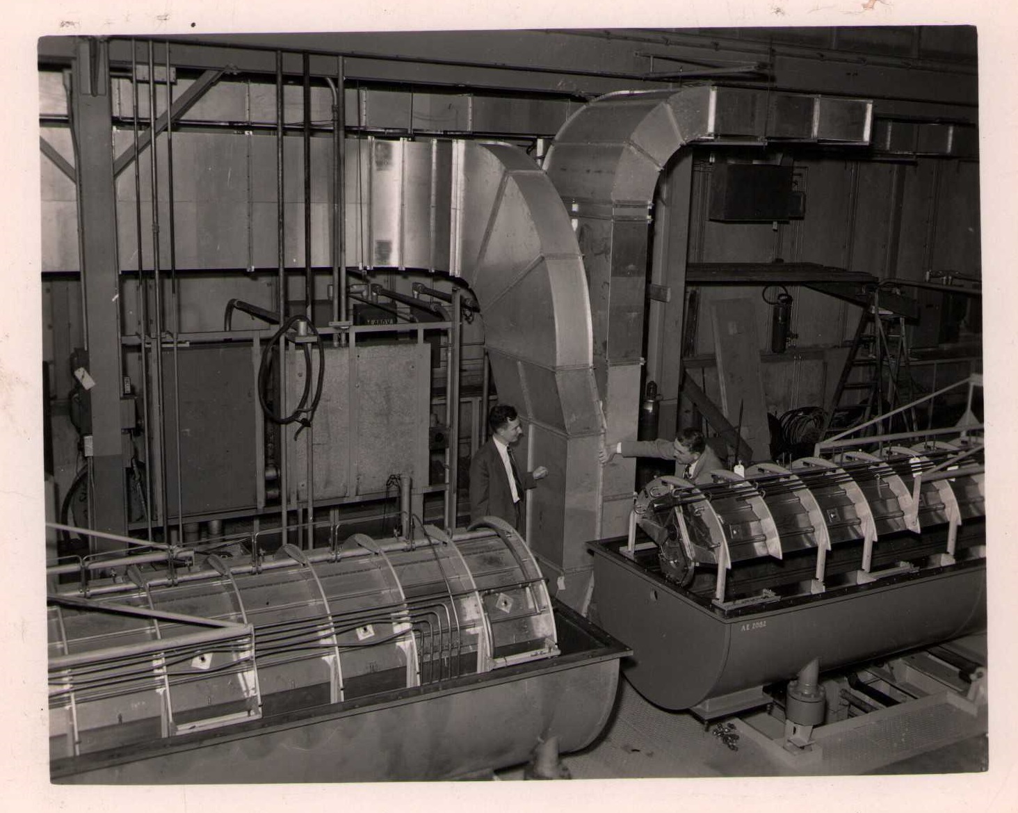 Luis Alvarez's linac, operational in 1947-48. This was the first proton linear accelerator and used drift tubes within a resonant cavity to accelerate protons to 32 MeV. On the back of each photo is stamped "Information Division, Radiation Laboratory / University of California, Berkeley, California." This set of photos was collected by Bernard Loach.