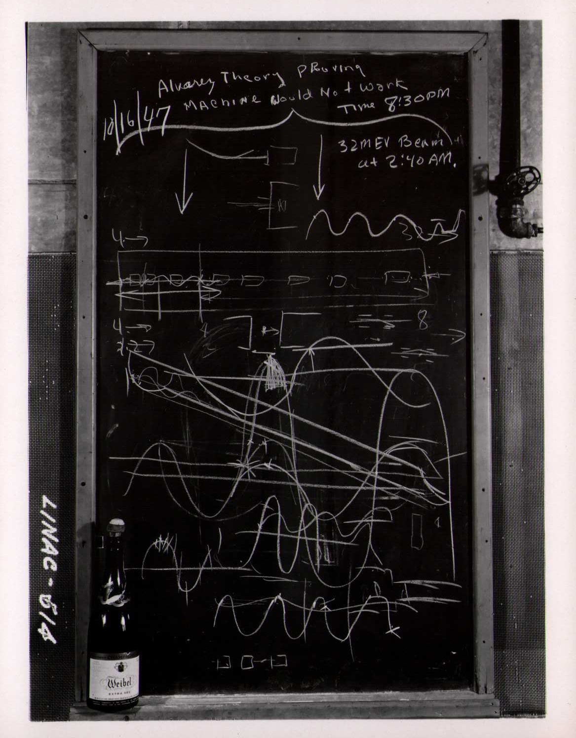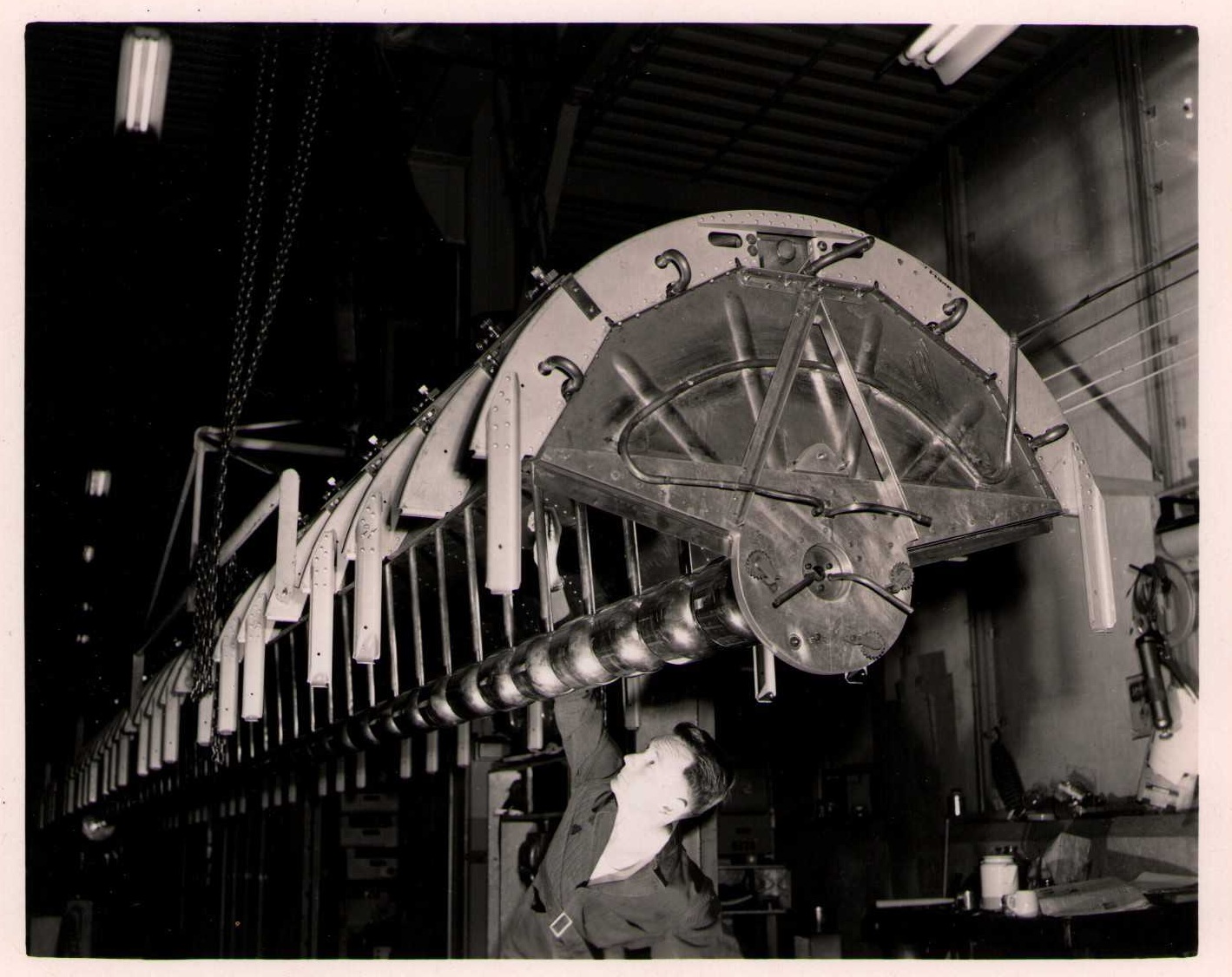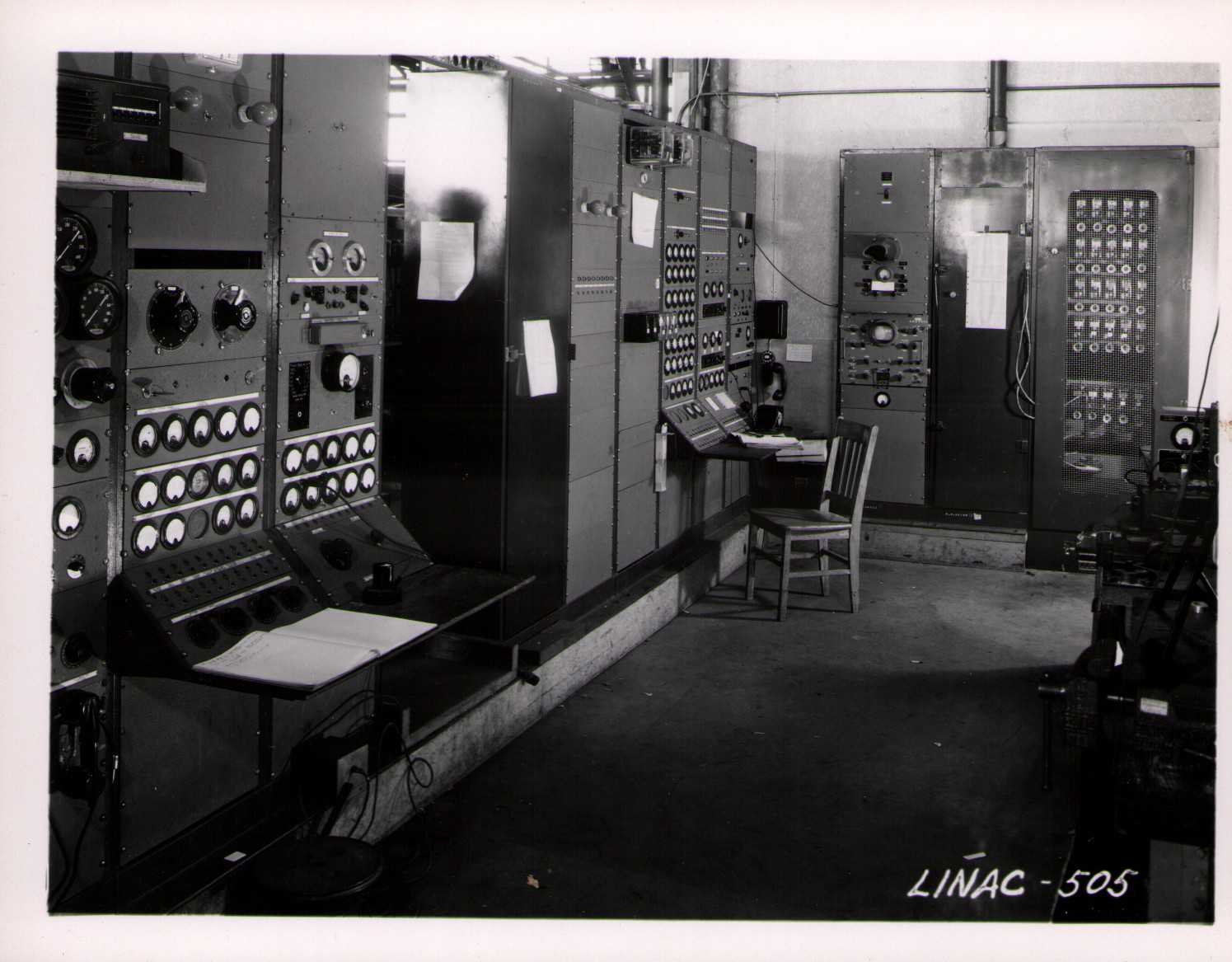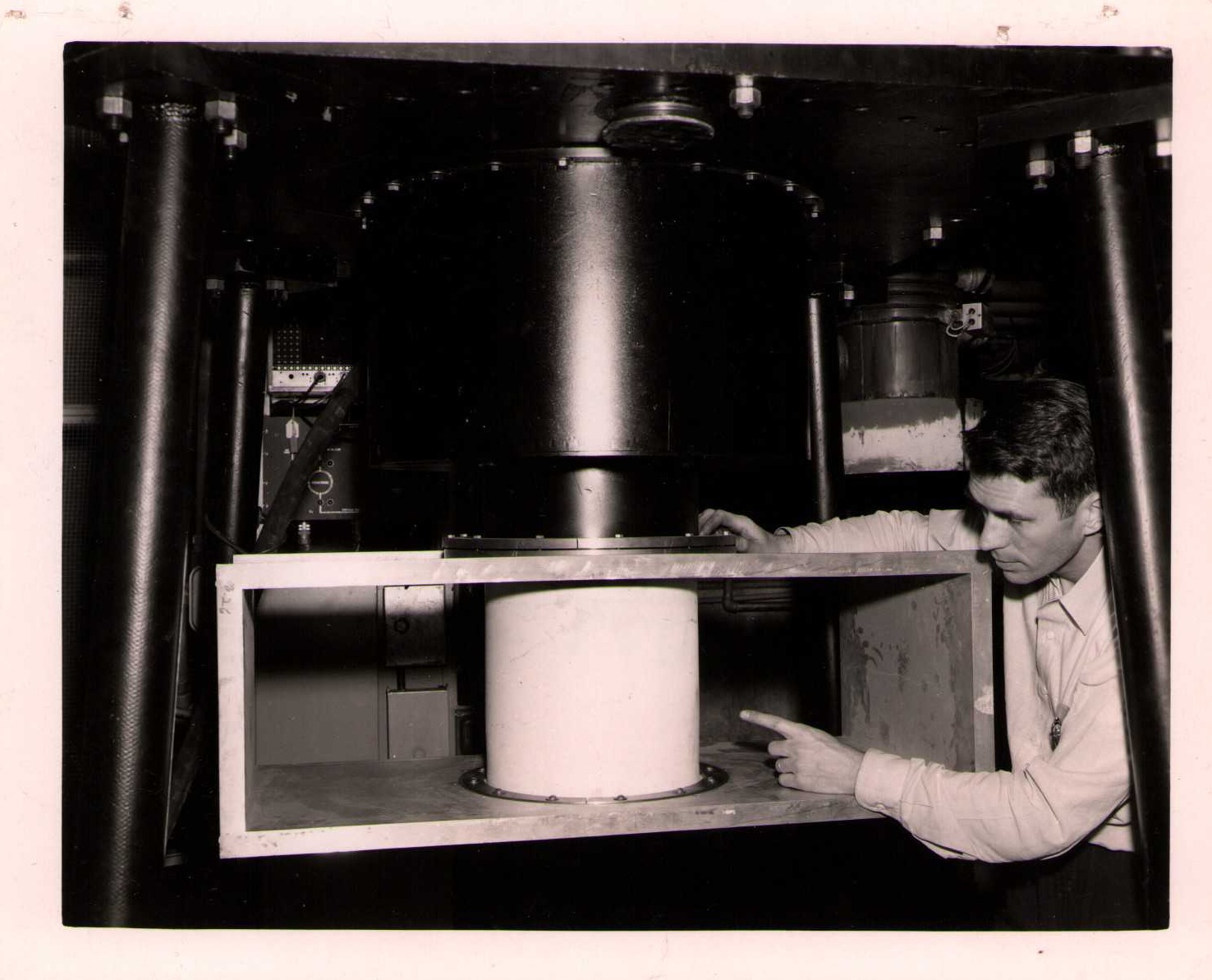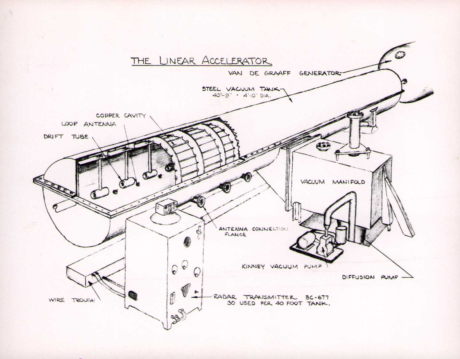 Luis Alvarez's linac, operational in 1947-48. This was the first proton linear accelerator and used drift tubes within a resonant cavity to accelerate protons to 32 MeV. On the back of each photo is stamped "Information Division, Radiation Laboratory / University of California, Berkeley, California." This set of photos was collected by Bernard Loach.