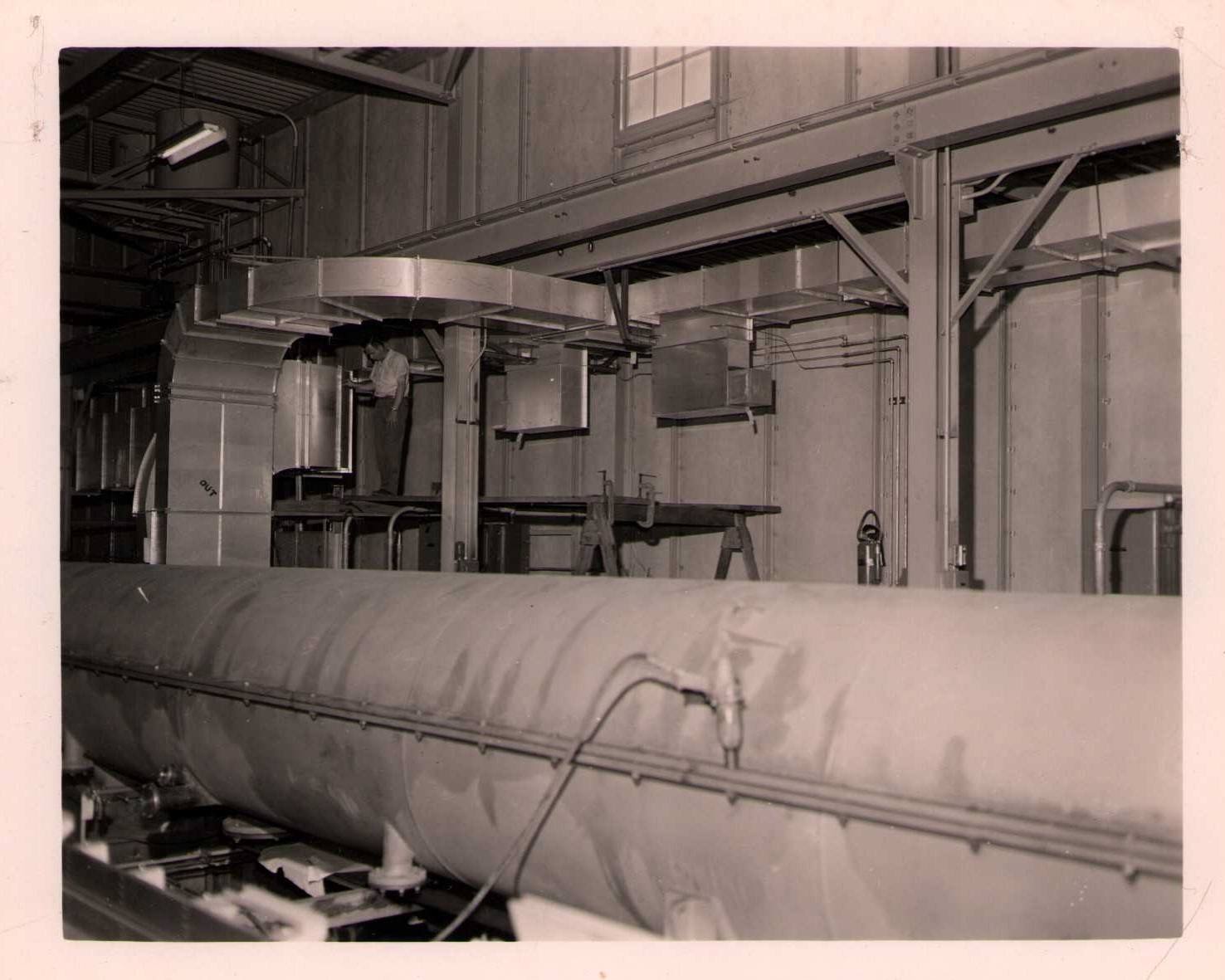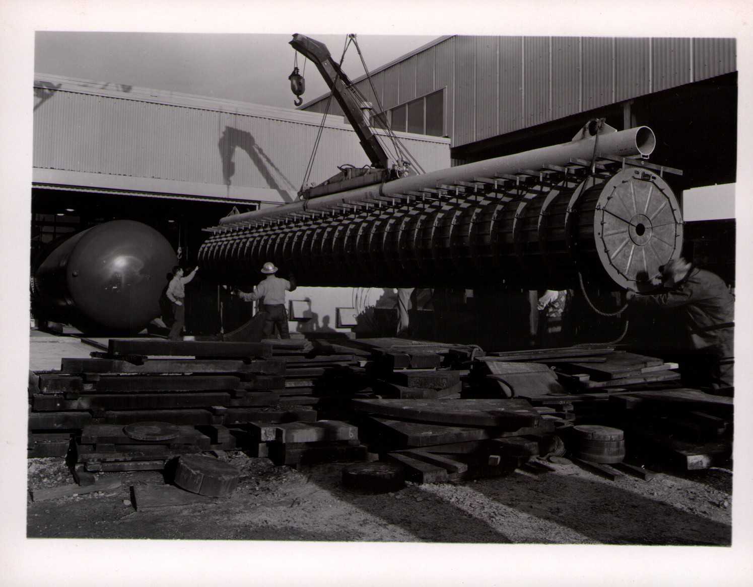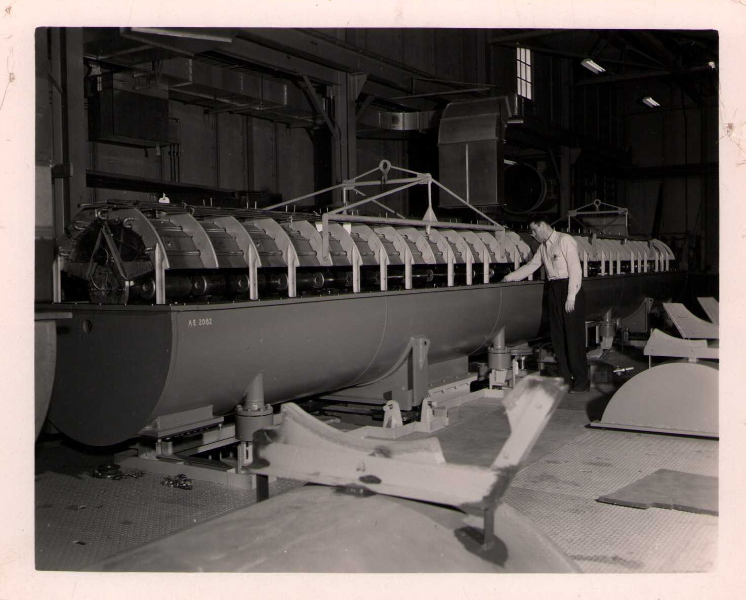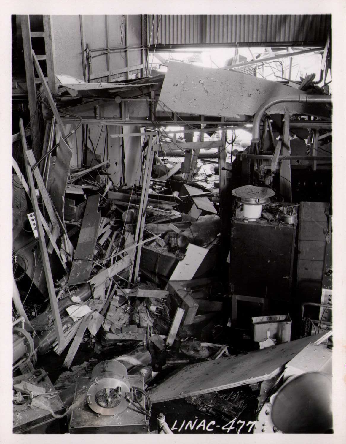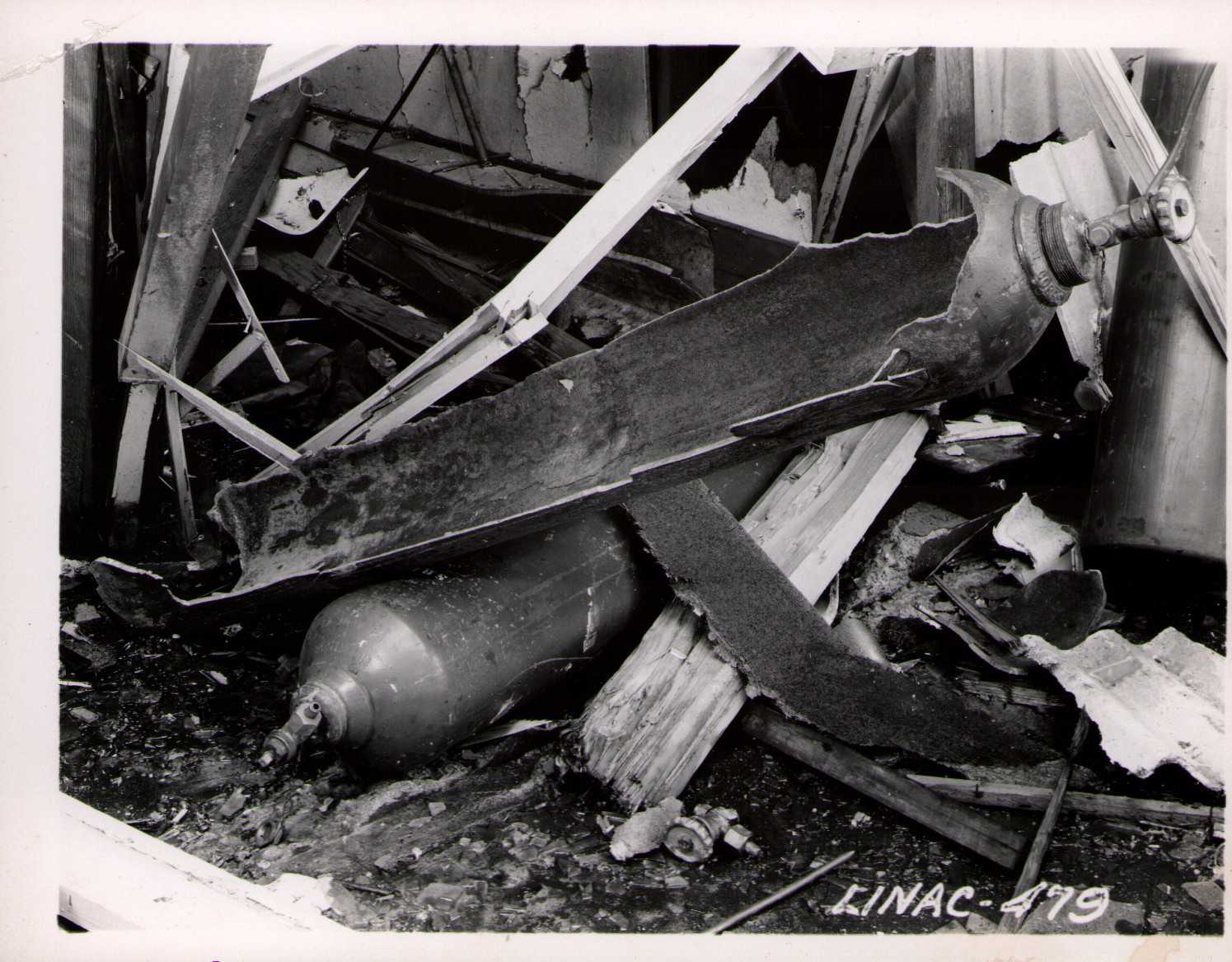 Luis Alvarez's linac, operational in 1947-48. This was the first proton linear accelerator and used drift tubes within a resonant cavity to accelerate protons to 32 MeV. On the back of each photo is stamped "Information Division, Radiation Laboratory / University of California, Berkeley, California." This set of photos was collected by Bernard Loach.