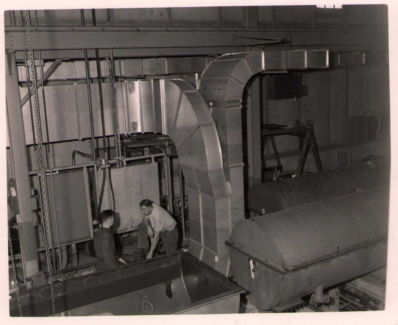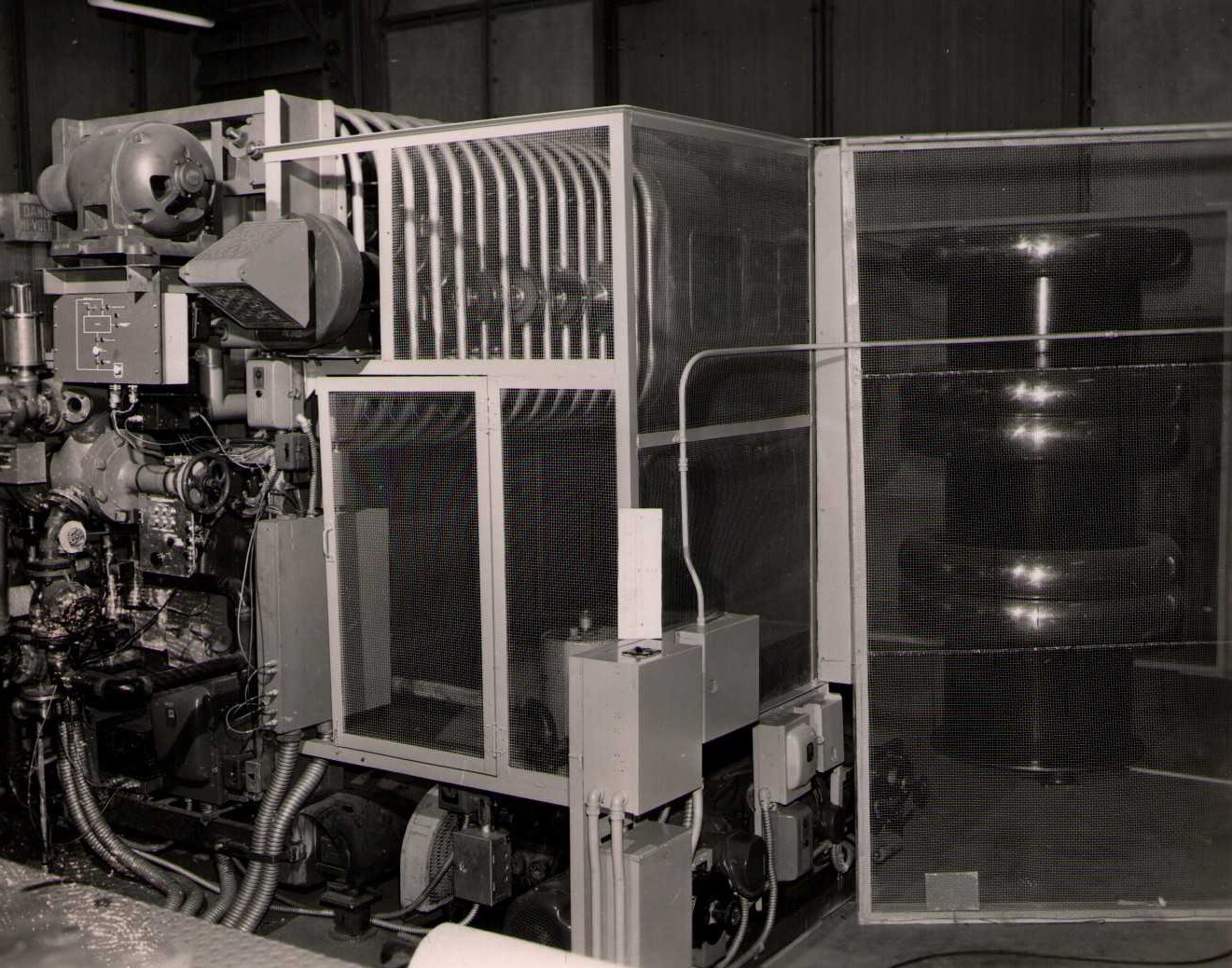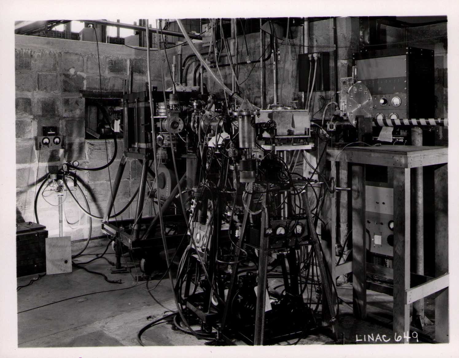 From the "University of Minnesota / Photographic Laboratory" stamp on the back of the photos, these are assumed to be the Physics Department's 68 MeV proton linac, one of the most powerful accelerators in the world in the 1950s. It was replaced by a Tandem Van de Graaff in 1966. This particular set of photos was collected by Bernard Loach. (Photographs 2b and 4b have "JDL" written next to them in pencil.)