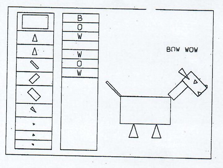 A list processing technique is used for the storage of pictures. Each new figure is stored consecutively at the end of a variable length list, called a stack. Each figure within the stack is called an array. Figures are referred to by specifying their respective stack and array numbers. Stacks and arrays can be altered either in total or in part. Hence, it is possible to individually alter entire frames, figures within frames, or points within figures. Figure 2 gives an example in which the arrays of two separate stacks are used to store the basic figures generating the dog and the letters comprising the text. Should it be desirable to wag both the dog's tail and ears, it is only necessary to modify the fourth and seventh array of the first stack. Thus, constant backgrounds and non-varying portions of a frame need not be computed more than once during an animated sequence.