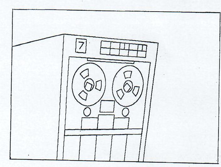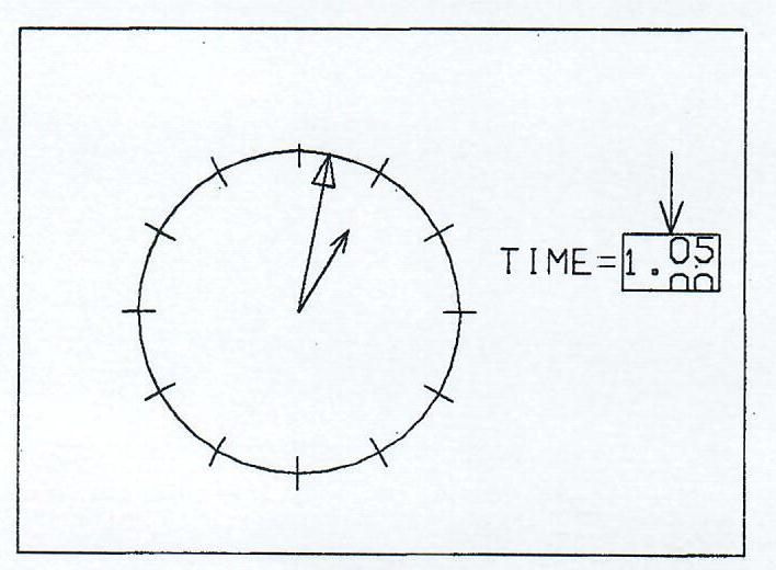 Figure 4 also illustrates the masking routine. By specifying the boundary of a rectangular area, it is possible to draw only those lines and portions of lines that fall outside of the specified area. As an application of the masking routine, Figure 4 is taken from a dissolve sequence in which the rectangular area is made successively larger until the entire title has been masked leaving a blank frame of film. In this way, an interesting scene transition is made. Windowing, the inverse of masking, is also part of the movie language. With this routine only those lines and portions of lines that fall inside a specified rectangular area are drawn. In Figure 5 the windowing routine is used to simulate an odometer. During the animation sequence, numerals move vertically through the window indicating current time on the clock.
