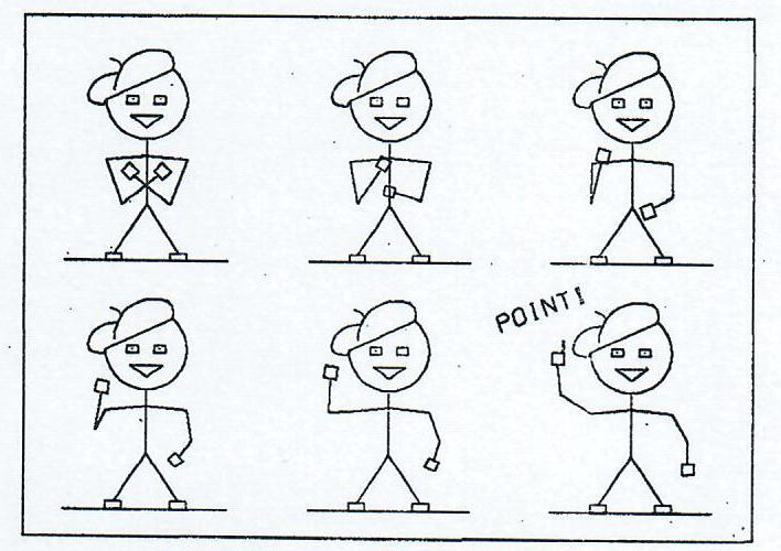 Commands are provided for the translation, rotation, and magnification of objects. The rotation command rotates an object about any desired center point by a specified angular increment. The magnification command expands or contracts all points of an object as measured from any specified reference point. Figure 6 illustrates the simultaneous use of magnification and windowing to properly truncate an object as it is blown up beyond the limits of the screen. Another command, helpful in animating sequences, is the MOVE command which moves an object in equal increments from an initial to final position. This is demonstrated in Figure 7 where the six animated figures are produced by means of only two MOVE commands.