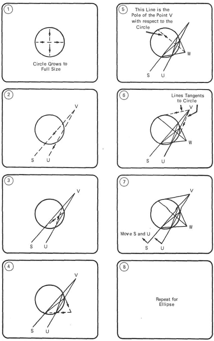 In this case, it was decided to produce a short film titled Pole and Polar. The basic construction illustrated by the film is shown in the storyboard diagram in fig. 4.1. The sequence is first constructed for a circle and then repeated for an ellipse. Finally, keeping the lines VU, VS fixed, the ellipse is gradually changed into a circle and then back to an ellipse again, to illustrate the general nature of the construction. The sequences are interspersed with titling, which has also been produced automatically on the microfilm recorder.