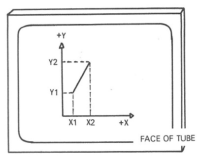 If an imaginary Cartesian co-ordinate system is assumed on the face of the cathode ray tube (Fig. 4.3), then this statement causes the electron beam to be momentarily deflected between the points (X1, Y1) and (X2, Y2) thus producing the line on film or paper. The orientation of the axes with respect to the film is given later.