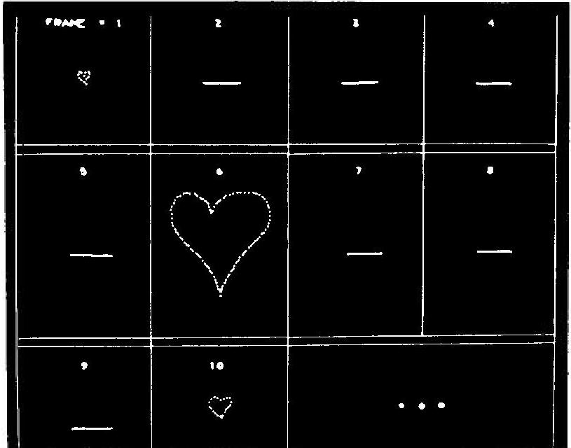 I also constructed a simplified animation system in which one could sketch components of frames. This appealed to the artist in Eric in a way that the other two systems had not. I then realized the need to couple the richness of dynamic control afforded by the use of waveforms and p-curves with the richness of static imagery to which artists and animators were accustomed. The ability to use waveforms and p-curves to define the translation of arbitrary sketched images, now part of the animation system, was clearly insufficient. Eric. continued to stress, and I continued to resist, the notion that animation required discrete picture change as well as continuous movement. What troubled me was an apparent conceptual gap between continuous movement and discrete picture change, and so I returned to the drawing board for another pass at the language design.