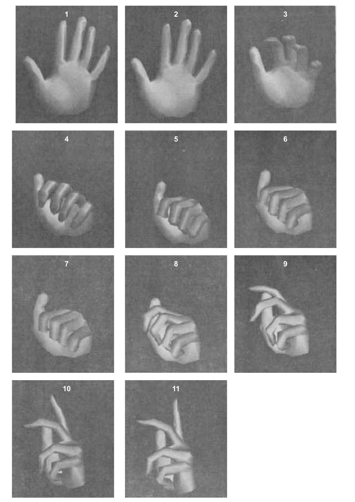 Figure 2 shows a sequence of 11 frames where a hand first closes and then opens in a fanout way. Notice that the motion starts slowly, speeds up, and then slows before stopping. The rate at which an object moves or changes can be specified by either some mathematical formulation (in this case a sine curve) or a table of empirical data. The program then integrates the area under some portion of the curve to determine the movement for each frame.