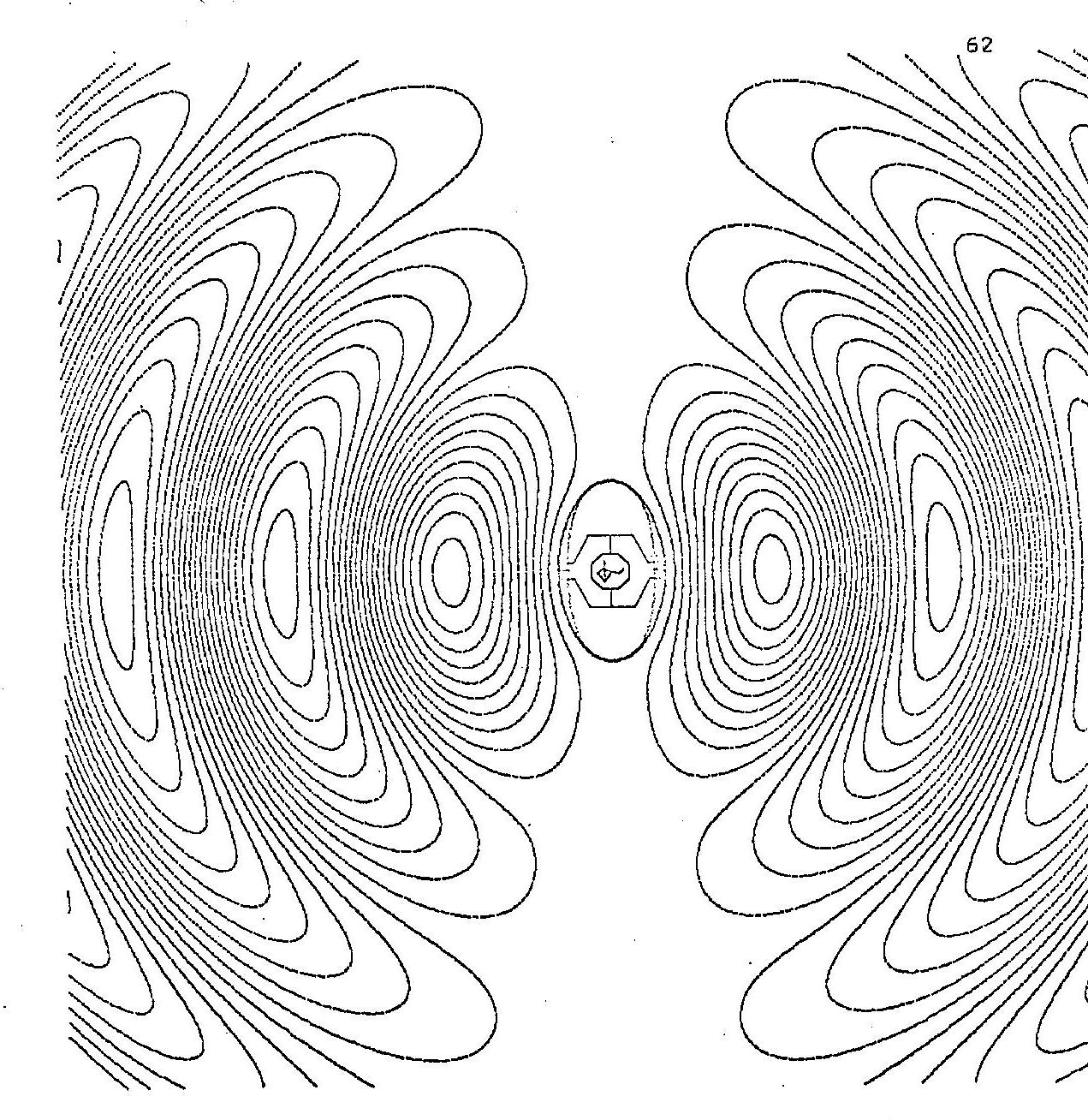 These equations hold for a resonant spheroidal antenna whose interfocal distance (2f) is λ/2. The points along a streamline are computed at approximately equal spacing through an iterative process. First, is incremented, then η is computed, followed by ρ, χ and the distance from the preceding point. If the distance between points is within set limits, the new point is stored; otherwise, the increment in ξ is changed by the ratio of the desired distance to the calculated distance, and the above procedure is repeated. When all the points for one streamline have been calculated, they are transformed into SC 4020 control words and placed on magnetic tape.