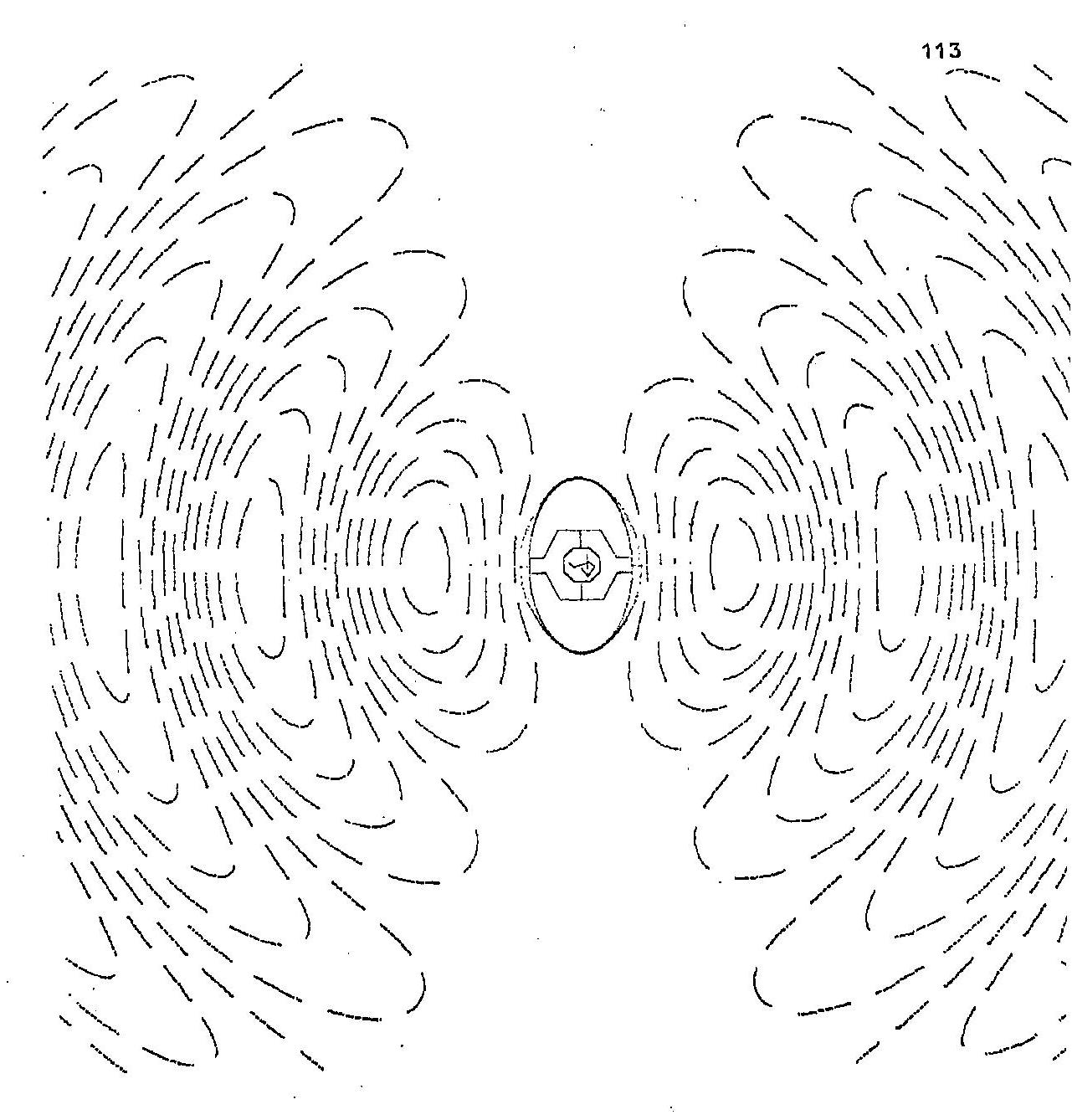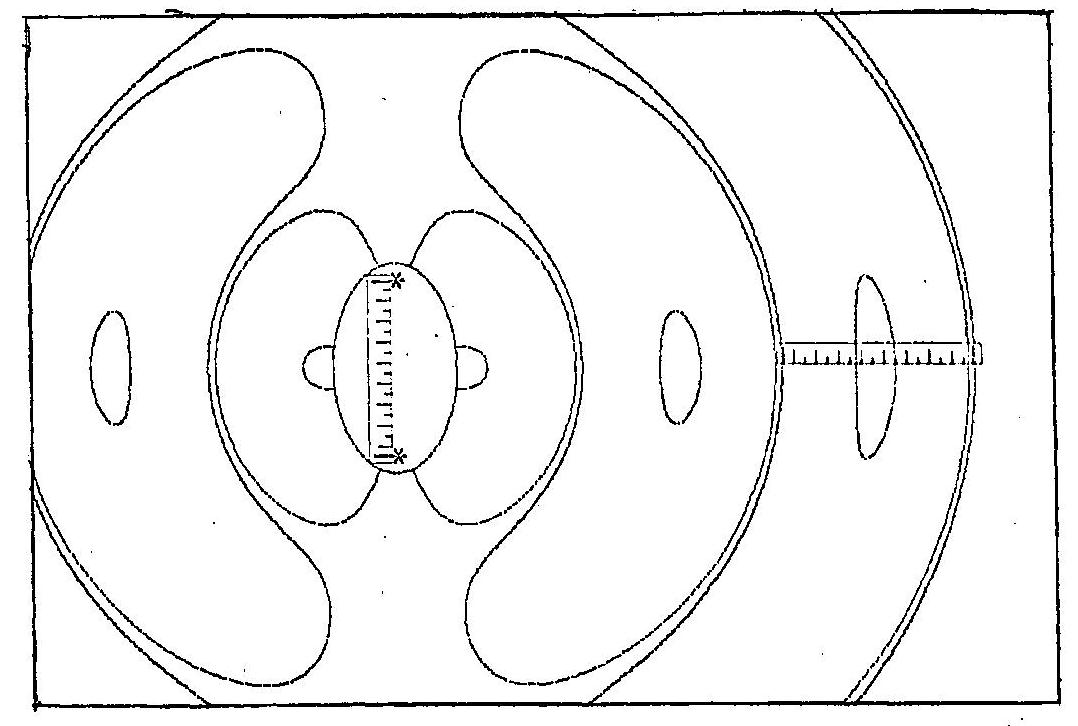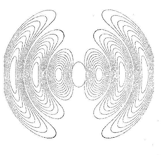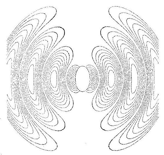 The subject selected was the resonant spheroidal radiator. The distribution of current on the spheroid was chosen to be rotationally symmetric so that the radiated field could be pictured with a two-dimensional representation of a plane section containing the interfocal axis. Figure 1 and Figure 2 show scenes from the movie. The field in the second picture is approximately 90 degrees out of phase with the first. The lines represent streamlines of constant potential, which are actually a plane sectional view of toroidal-shaped tubes. The stream surfaces in the three-dimensional case represent surfaces over which no displacement current flows. The mathermatical basis for these surfaces can be derived from Ampere's law. If H is independent of φ and the path of integration is a circle normal to the interfocalm axis, then
