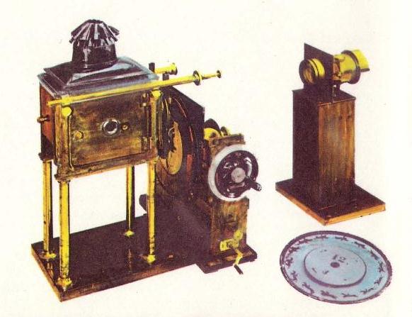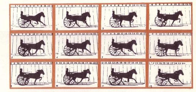 Whether or not the bet existed, the Governor certainly turned, in May, 1872, to Edweard Muybridge, the Director of Photographic Surveys for the US Government, to find the answer to the question that had troubled artists for over two thousand years. Muybridge set a battery of trip-wire operated cameras at intervals along a track at the Govenor's ranch. It took the exposure of half a million wet plates before he succeeded in taking true moving pictures in 1879. A year later his Zoopraxiscope projected onto a screen animated photographs of animals, birds and athletes. The cinema was born.