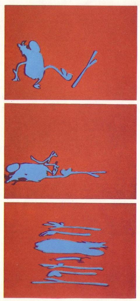 A typical sequence of a man walking up to a stick, kicking it, falling back and breaking up into his component parts was planned, timed, programmed into the computer and recorded onto video tape in about five minutes. The makers of CAESAR claim that with standard equipment a conventional animator might take as much as two weeks to animate and photograph the same sequence. On the other hand, computer animation cannot match the sophistication afforded by traditional methods - it will be some time before we are likely to see a computer character who can emote as dramatically as Donald Duck.