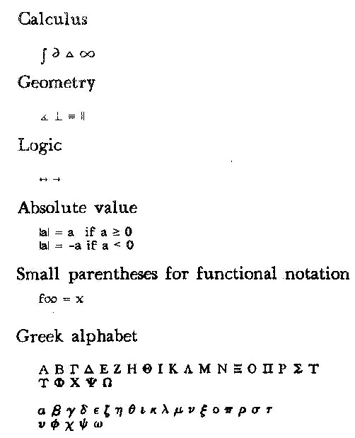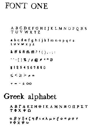 Three fonts of letters are described which are useful as a computer output medium for many applications. The fonts include both lower and upper case Roman letters in three sizes, lower and upper case Greek letters in two sizes, digits in three sizes, and an assortment of mathematical symbols in three sizes.