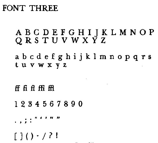 The fonts were originally designed to be produced on a Stromberg-Carlson 4020 microfilm printer. This device has a 1024 raster of computer addressable points. A vector can be drawn between any two points. The resolution is limited by the width of the vector which is about 2.3 raster points. Normally the middle sized font would be used for standard text, the small size for footnotes and subscripts, and the large size for titles. There is, of course, no limitation to these uses.