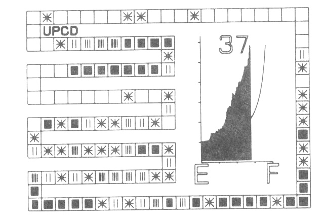 Rather than use a standard symbol to define an allocated entry, the symbol is used to indicate the length of search required for that entry. In general, a table entry which requires a search length of S is represented by S equally spaced vertical lines. The entries with a search length of 1 are not represented by a single vertical line but by an asterisk. This is done so that the minimal search length entries stand out. The student should realise how large a number of entries is accessed with a minimal search length.