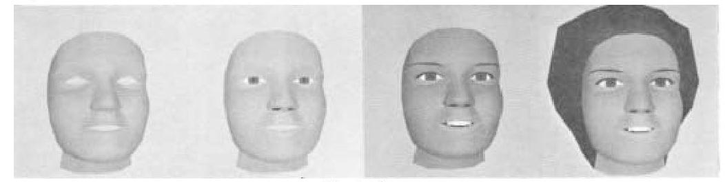 The details of the face are very important in achieving realistic results. Figure 3 shows the effect details, such as the eyes, eyebrows, eyelashes and teeth have on the realism of the face. The eyebrows and teeth were included simply by adding polygons of the appropriate color. The illusion of eyelashes was achieved by changing the color of existing polygons directly above the eyes. The face by itself is not very realistic. It was necessary to complete the head in order to be convincing. Figure 3 shows how a bonnet of hair was used to complete the head.