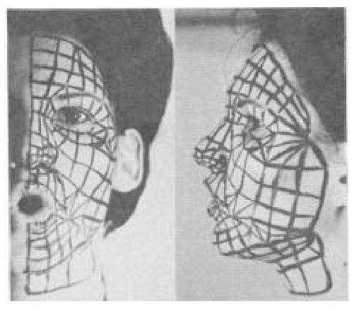 If we still have our assistant whose face is painted with polygons, we ask the assistant to assume a number of different expressions. We freeze each expression photographically. For each expression a pair of orthogonal views of the face is taken, one from directly in front and one from the side. Figure 5 shows a typical pair of these photographs. Using these pairs of photographs we establish an origin and a coordinate system. The three-dimensional position of each point is measured directly from the photographs.