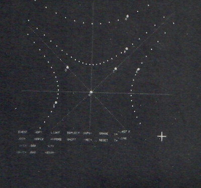 Other light buttons are used to erase selectively (ERASE), to clean the slate (RESET), to contract and expand the scale of the display (ZOOM), to join events with lines (JOIN), to draw through any event: an invariant hyperbola (HYPERB) Or crossed straight lines at 45 degrees from horizontal (LIGHT) or a horizontal line (HORIZ) or a verticle line (VERT). The respective space and time coordinates of two events can be added to create a third event (ADD).