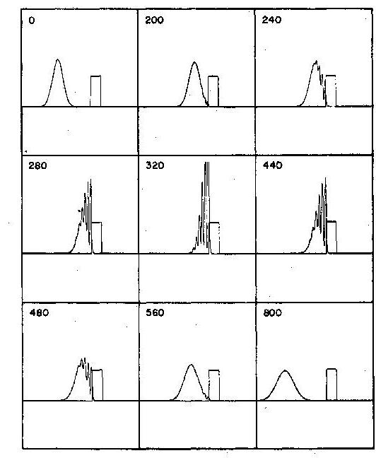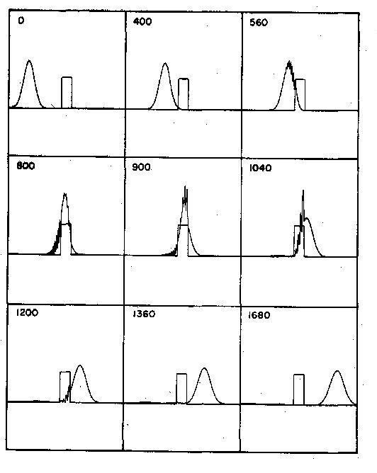 This is to be understood in terms of the real world as the cumulative result of a succession of a large number of independent identical experiments, each one of which by itself is unpredictable. One can detect both classical and non-classical patterns of behavior in these situations. For example in the first scene of the film entitled Barriers (see Figure 10), one observes the probability distribution for a particle that is approaching a barrier with an energy that is not sufficient to allow it to be transmitted. During the most violent part of the scattering the probability distribution penetrates the region of the barrier. This corresponds to a finite probability at that time of finding the particle in a region that is inaccessible to it in a classical description of nature. On the other hand, toward the close of the first scene one sees the wave packet reflected from the region of the barrier in much the same way that a classical particle would bounce off a wall. The viewer will note, however, that the probability distribution has widened substantially since the beginning of the process. This, too, is strictly quantum effect.