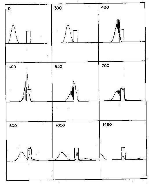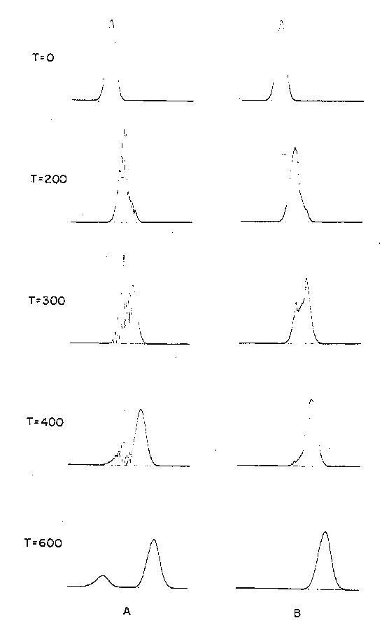 The equation to be solved is the time dependent Schroedinger equation. In general we solve this partial differential equation in position space for the complex function (x,t) at each time t for somewhere between 1000 and 2000 values of x. Except where otherwise indicated the absolute square of this function is the plotted curve in the figures. Interested readers may find the computational techniques described in Am. Jour. of Phys. 35, 177 (1967).