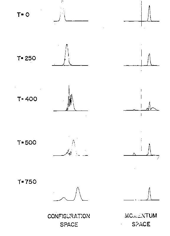 As long as the particle travels freely toward the region of the force the distribution of momenta remains unaltered, an aspect of quantum theory that Newton would have been content with. As the particle begins to feel the effect of the force, the distribution of momenta undergoes severe distortions, due in part to the increased kinetic energy (and therefore increased momentum) as the packet passes over the potential well. After a short while the momentum distribution begins to develop a peak centered about some average leftward momentum, the momentum of the reflected packet. When the interaction between packet and well is completed, the momentum distribution again remains constant while the probability packets in configuration space sail majestically offstage. Figure 13 shows these two descriptions of the collision at five instants of time.