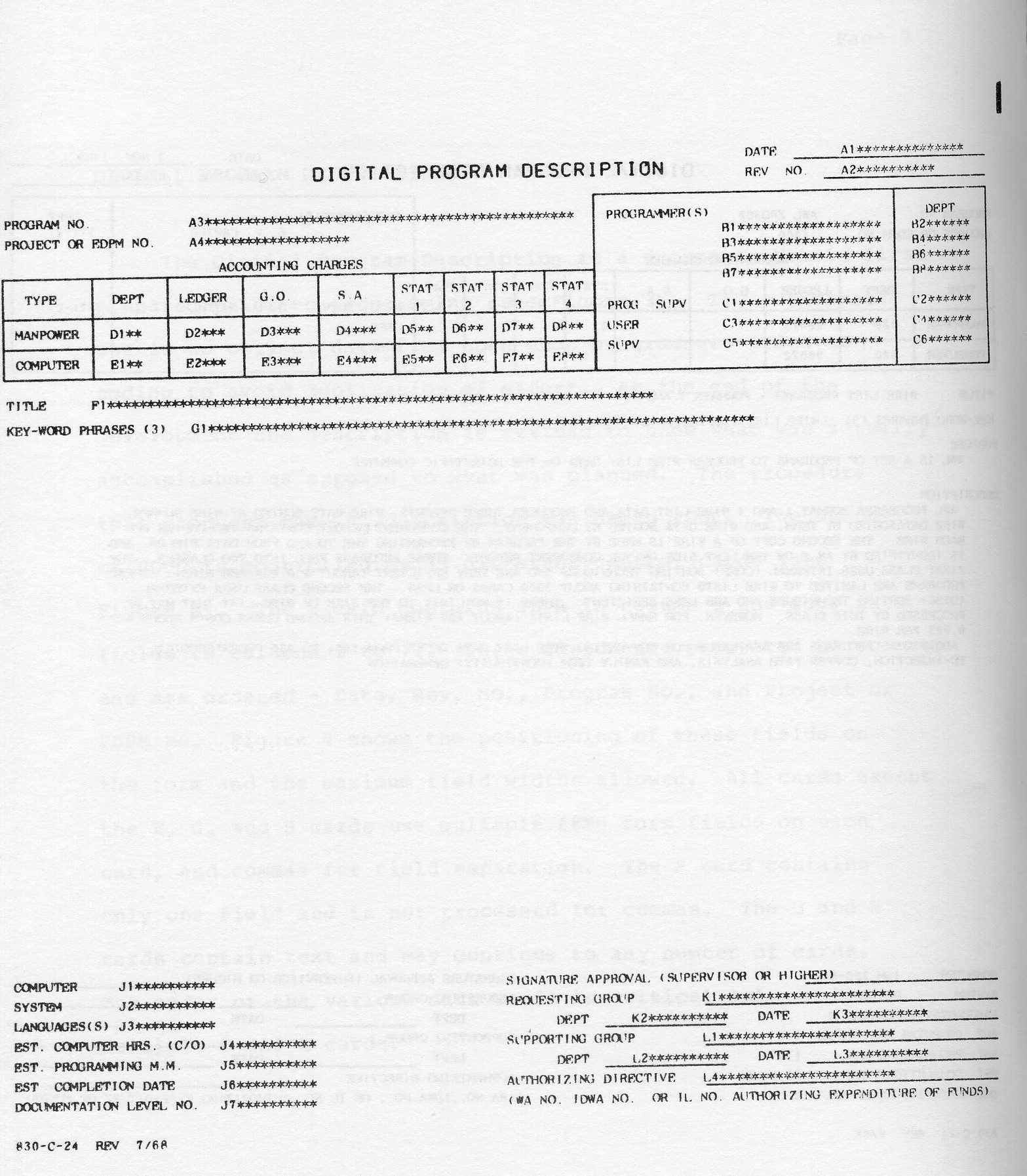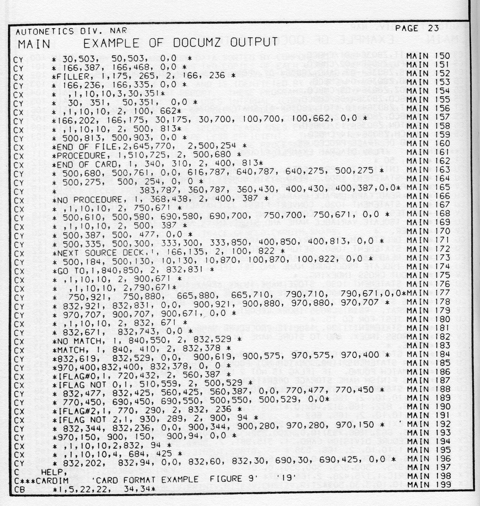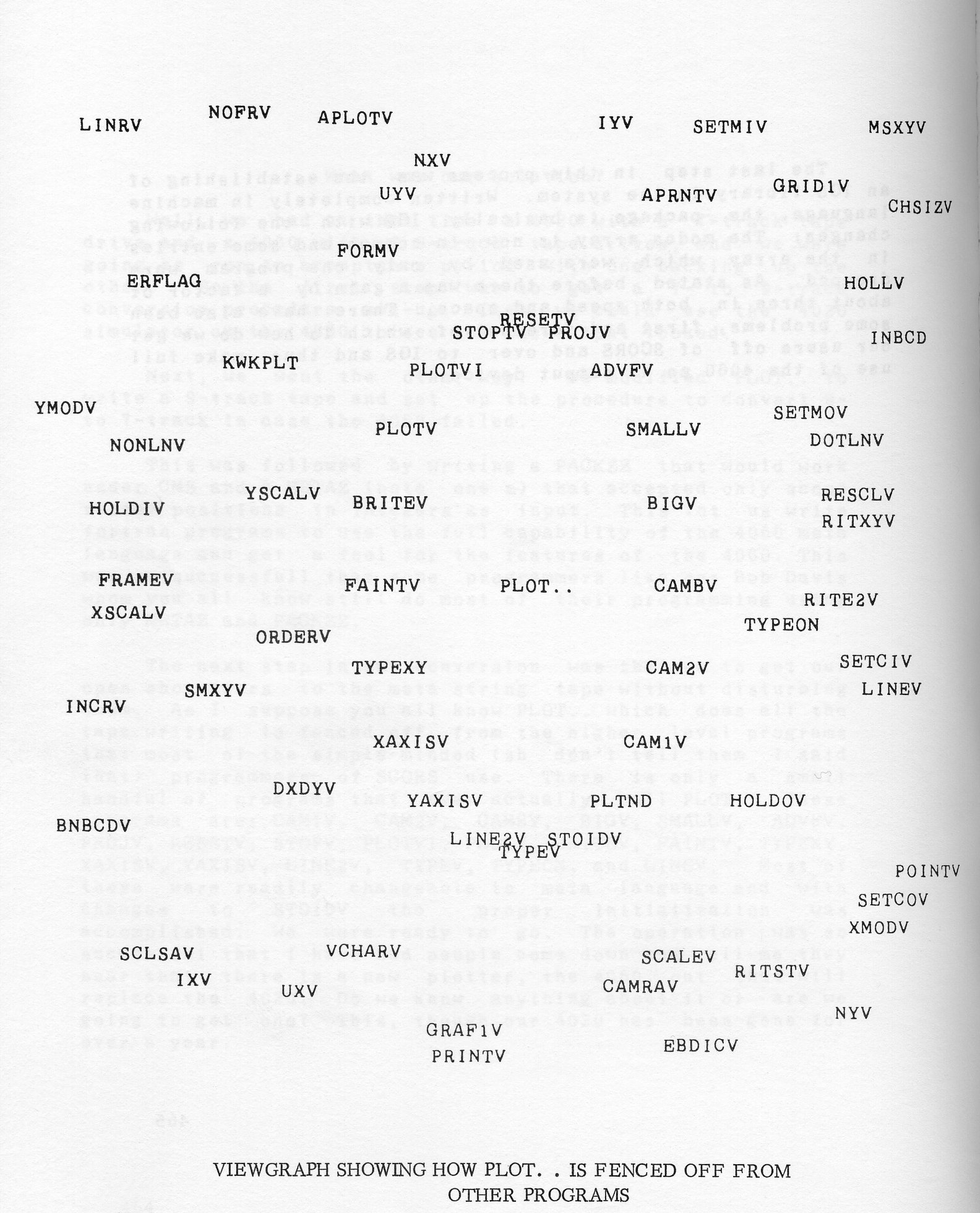 The prototype version of EXPLOR was implemented, because of historical reasons, in BE-FAP [6] on an IBM 360/50 emulating an IBM 7094 (with hardware-implemented convert instructions); it occupies 420008 locations, which includes the internal picture storage. The output device is a Stromberg DatagraphiX 4060, using a 4020 simulator modified in the following ways: right and left margins were extended giving an effective raster of 1024 × 1366; the period is output as the largest plotting dot, and character spacing in typewriter mode is changed to four 4020 units.