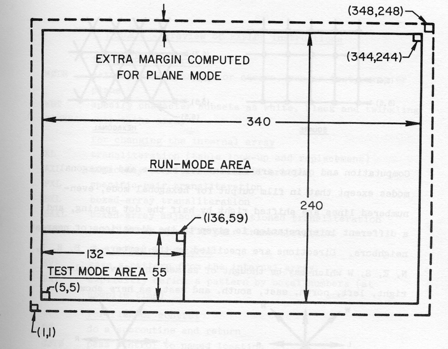 The programmer imagines significant areas for different modes of operation as shown below. The normal run mode area is 340 units wide by 240 high; in the test mode, only the indicated 132 × 55 area is computed internally, and it is output by printer, not via microfilm: