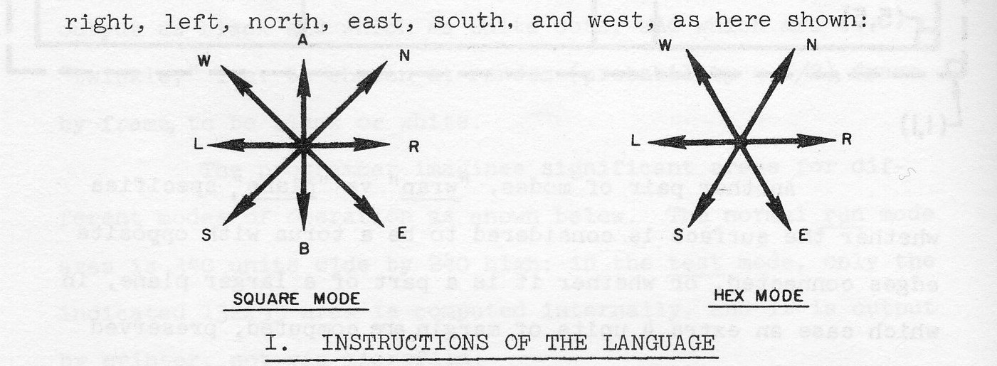 Computation and output are similar for square and hexagonal modes except that in film output for hexagonal mode, even-numbered lines are shifted right by half the dot spacing, and a different interpretation is given to the directions of nearest neighbors. Directions are specified by the letters A, B, R, L, N, E, S, W which may be thought of as meaning above, below, right, left, north, east, south, and west, as here shown: