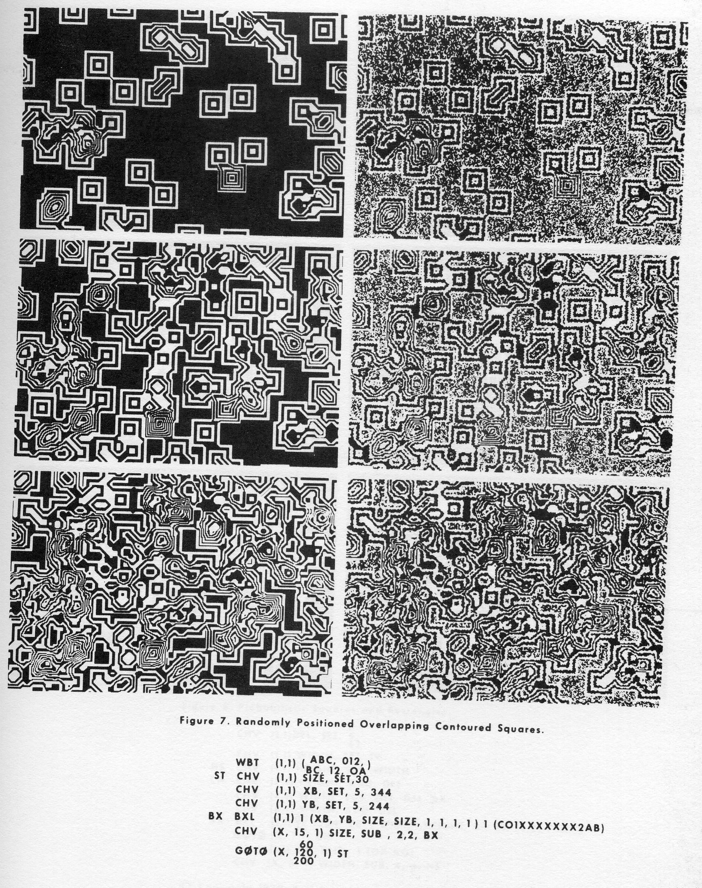 Figure 5 illustrates the production of designs based on an explicitly defined pattern, in this case the letters BTL. Each time the pattern is laid down., an x-y location is chosen at random, also a size from 2 to 5. The pattern is first written in 0's, then displaced downward and to the right and written in A's. In the left-hand outputs only one black-white pair is written each time; in the right hand set, four successively displaced black-white pairs are overlaid each time.
