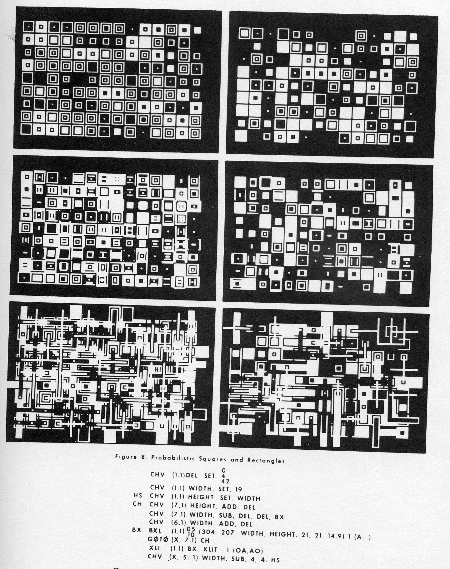 The last example, Fig. 8, is another demonstration of artistic effects, generated here simply as a probabilistic collection of squares and rectangles. The forms are drawn in five successively smaller sizes, alternating between black and white.