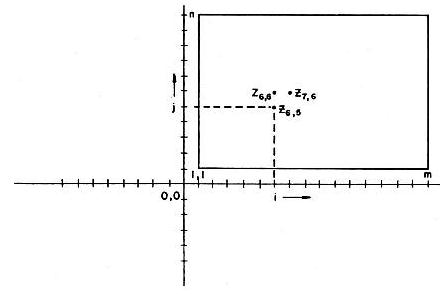 Before we discuss both methods, it will be useful to establish some conditions. The first is that the spatial location of a given point is a function of its two-dimensional subscripts. The program is requested to contour a two-dimensional array Zi,j, where i runs from 1 to m and j from 1 to n, as shown in Fig. 1. The Zi,j values can be mapped onto x,y coordinates of the CRT scope by x = f(i,j) and y =g(i,j). The f and g are transformation functions. We shall give several examples of transformation functions in Section 4.