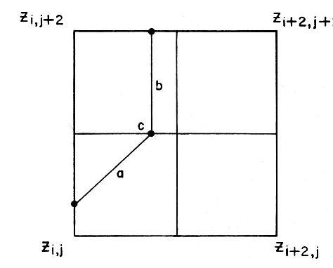 While this contouring scheme is extremely simple and therefore fast, it has the drawback of redundant plotter instructions. For example, as shown in Fig. 4, program logic requires that c be calculated to find segment b, even though c was already calculated when segment a was drawn. This is a serious drawback when using a map projection with a complicated transformation formula.