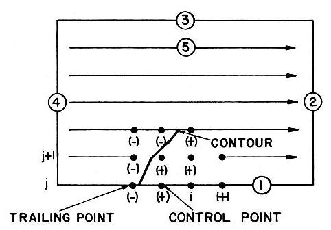 The array is scanned in five parts, as shown in Fig. 5 first the bottom, then the right side, top, left side, and finally the interior. A contour line beginning as shown in Fig. 5 has associated with it a control point and trailing point. The contour is followed by using the control point and searching the surrounding points to see where the contour crosses into a new cell. We have arbitrarily defined the control point as being above the contour line, and we search the surrounding points in a clockwise manner. Fig. 6 shows the surrounding eight points for the interior of the array. Some of the surrounding points are excluded on the boundaries and corners. During the search, each new end point is tested. If it is below the contour value, we proceed until we find a value above. This means that the contour crosses between the last two surrounding points in the search. We then move the control point to the new cell and repeat the procedure. A contour beginning on the boundary must end somewhere on the boundary. Interior contours end when the control point and the search position are identical. This can be verified by first drawing a grid with contours on it and then following the above procedures.