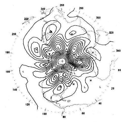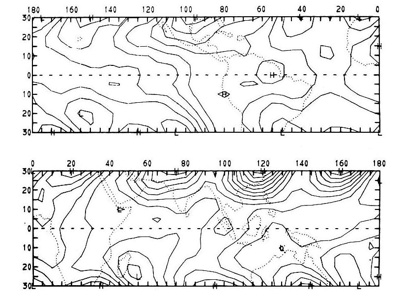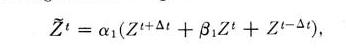 where Z is the smoothed value, Z is the unsmoothed value, t is time, Δt is the time interval (4 hr in our case), α1 and β1 are smoothing parameters equal to 0.25 and 2.0, respectively. This type of smoothing heavily clamps motions with a period of 2Δt, motions which would be quite noticeable in a movie since they cause very rapid changes. The time-smoothed values are then interpolated between two time-intervals, say, t and (t+Δt). In our current movies, we interpolate 20 frames. A space-smoothing is finally applied to the interpolated fields to rid them of small-wavelength noise.