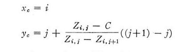 The second condition is that linear interpolation is sufficient to find the endpoints of a contour line between two adjacent Z values. The case of Z values being the same as the contour value must be taken into consideration. We always treat equal values the same as values above the line. For a contour line passing between two Z values, one Z value must be above the contour line value (+), the other below (-). Consider the case where Zi,j is above the line and Zi,j+1 is below the line in Fig. 2. The wanted endpoint of the contour line of value C is then determined as follows: