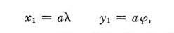 In the cylindrical equal-spaced projection (Fig. 7 ) the parallels and meridians are equally spaced so that the parallels are their correct distance apart. The x1,y1 mapping of a point of latitude and longitude X is given by