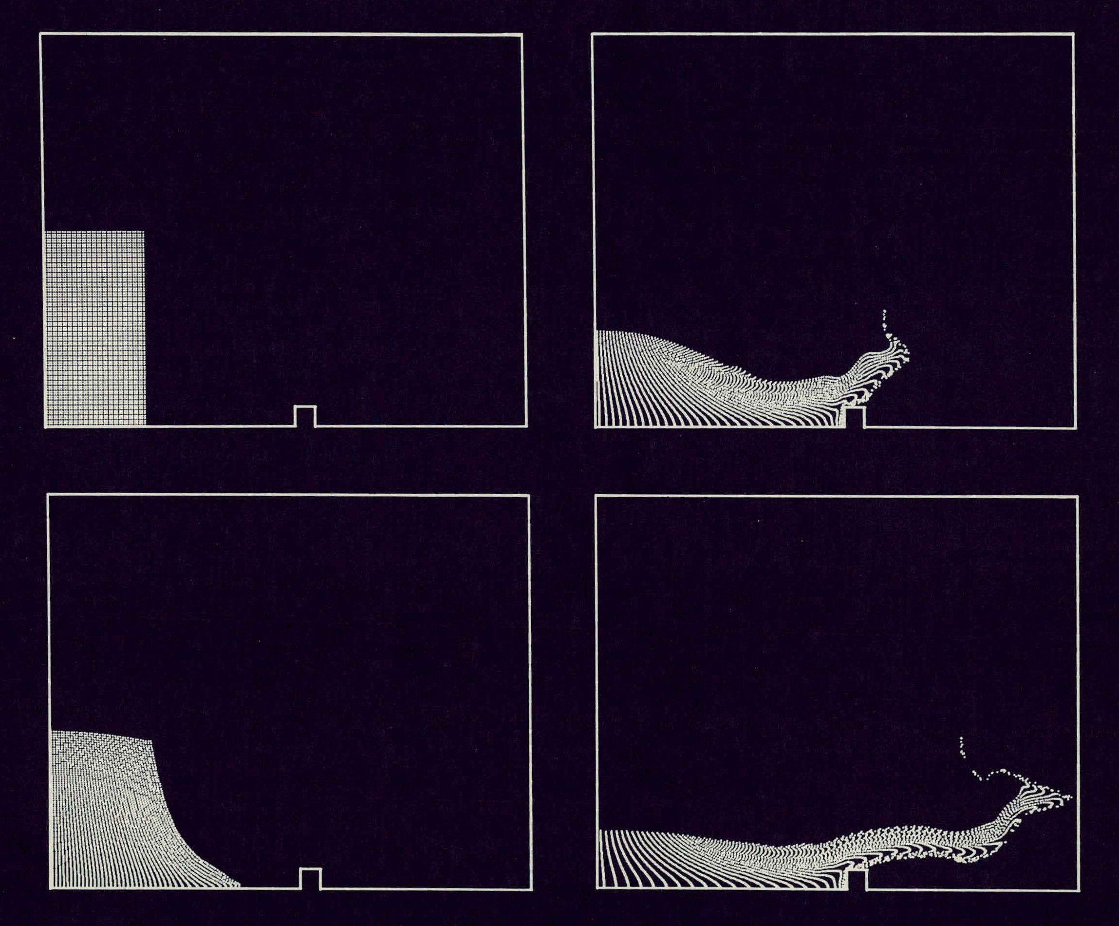 Figure 2 shows a set of particle plots which represent the flow of water from a broken dam. The first frame in the picture shows the fluid configuration an instant after the dam has broken (dam pieces have been removed). Subsequent frames show the water as it flows downstream and collides with an immovable object. The mesh of cells is not shown in these plots.