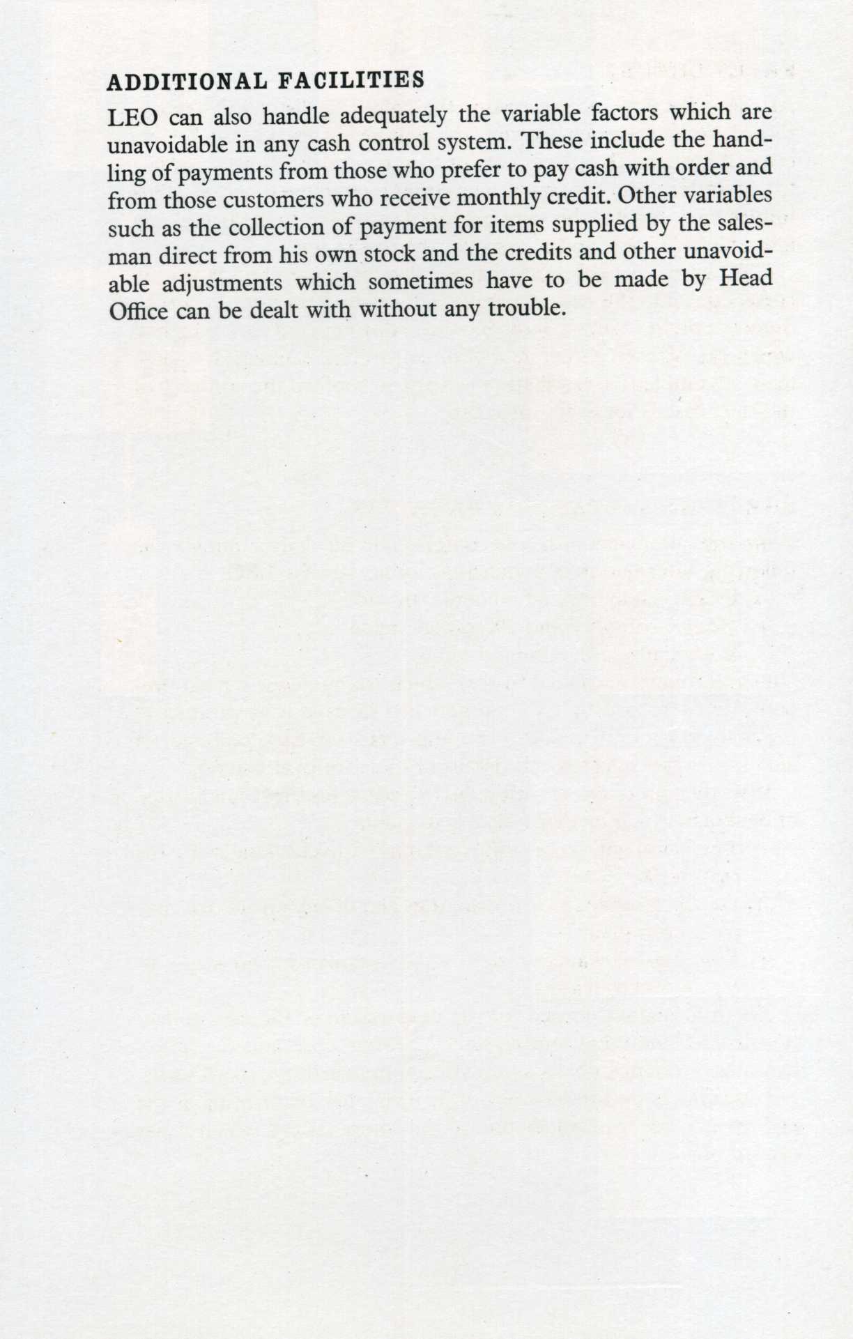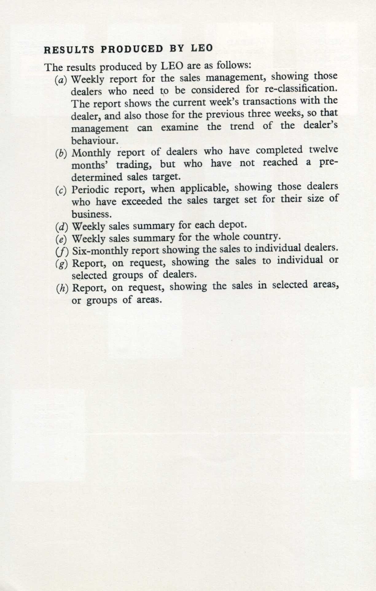 The customers are grouped into classes and LEO is required to compare their purchases with standards which vary according to weather and other conditions. LEO then reports those agents whose purchases deviate significantly from standards, and the information produced enables sales management to plan calls upon customers economically. In addition, LEO produces sales statistics for individual customers or groups of customers. For a similar reason to that given in L5, this job covered only a limited number of areas.
