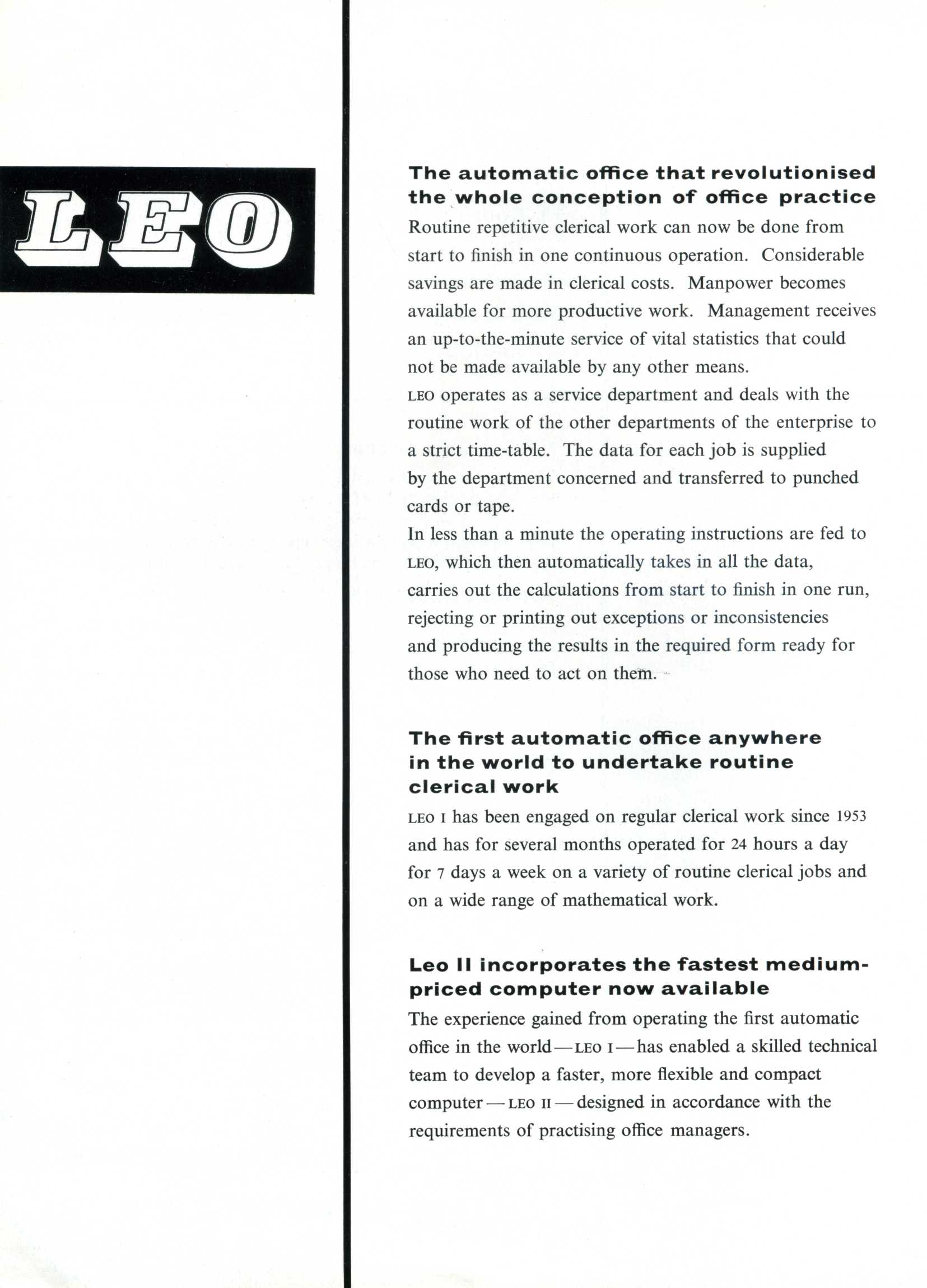 Previous system - 50 clerks LEO system - 22½ clerks A saving of - 27½ clerks ----------------------------------------------------------------